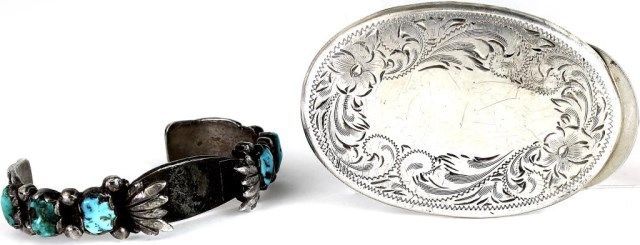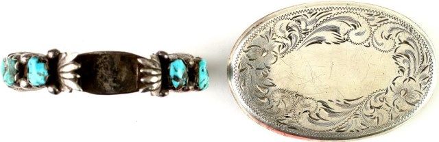 mans belt buckle stamped Diablo and sterling on the reverse, features hand engraving and early heavy cast sterling and turquoise unmarked watch band. Est. 175-350