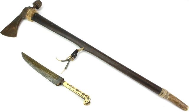 knife with 5 1/2" blade and brass sheath, and contemporary brass head pipe tomahawk 23" long. Est. 100-200