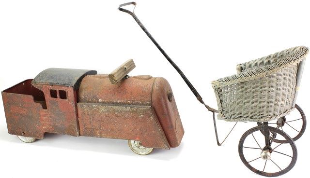 carriage with original paint, measuring 24" long including handle, and ride on toy train. Est. 100-175