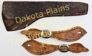 includes early horse and rider holster for Colt 7 1/2 complete with toe plug and original belt loop, and pair Althoff Saddlery spur straps. Est. 100-175