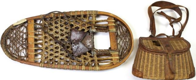 fishing creel with all leather straps intact and an early Snow Craft Norway Maine USA snow shoes stamped US 1944. Est. 200-350