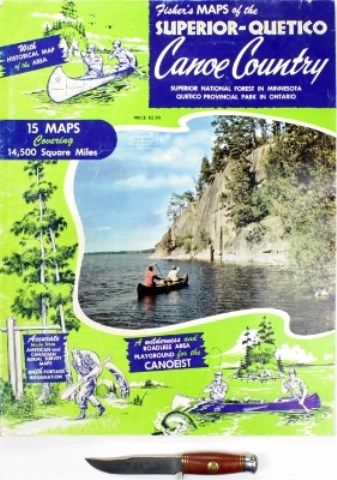 Quentico Canoe Country map for Minnesota & Ontario, 15 maps total published by Fisher Company and a leather stacked handle hunting knife with BB Cody etched on the blade. Est. 25-75