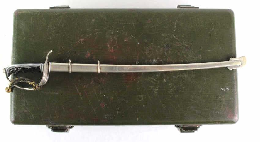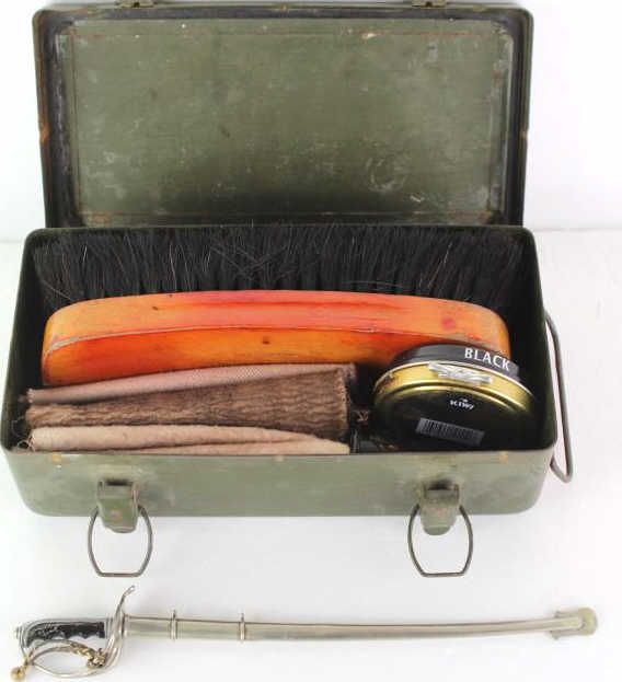 Collection of 2 includes military shoe shine kit and miniature sword with scabbard 9 3/4" long.