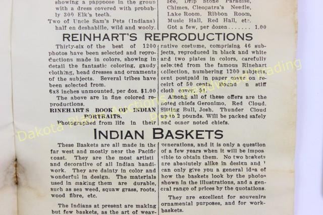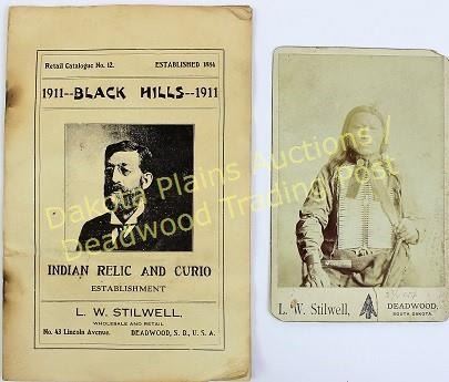 Collection of 2 includes original L.W. Stilwell1911 retail catalog and cabinet card of  Plains Indian "Medicine", 4 1/4" X 6 1/2".  Stilwell established his wholesale and retail  Indian relic and curio shop in Deadwood in  1884. His collection was considered thelargest and finest of the time supplying many  museums around the world. Cabinet card good  showing some light wear and loss to upper  corner of card stock. Back with glue spots.  Catalog good with light folds and creases,complete with 21 pages.  Est. 400-800