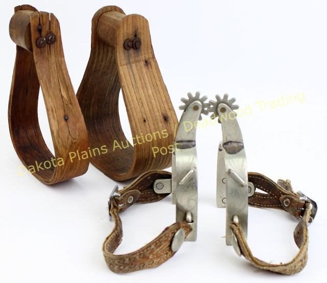 includes pair Rinalde short shank bronc spurs with straps and childs size bent wood saddle stirrups. Est.