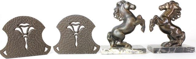 rearing horses on marble base 8" tall and pair unmarked arts and crafts bookends in cast iron. Est. 150-250