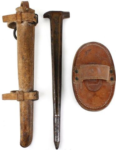 marked Herber Brush Co. and US Cavalry pickett pin with original leather sheath, pin showing original black paint, sheath very good. Est. 125-200
