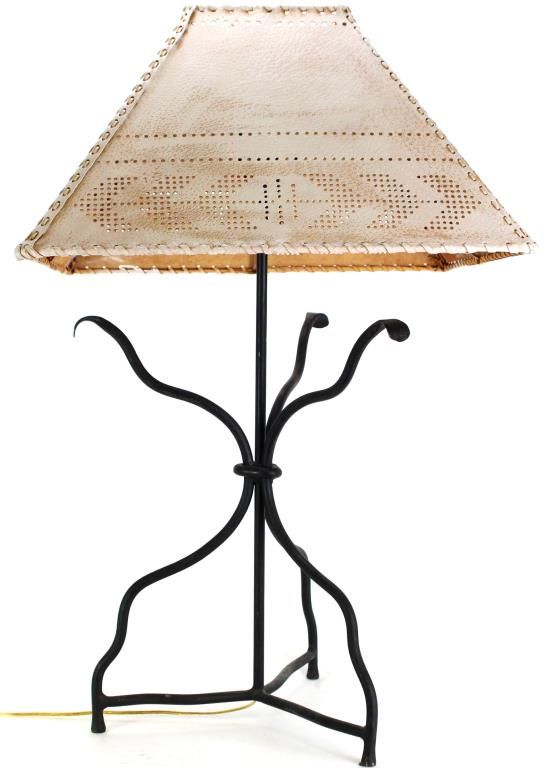 Collection of 2 lamps includes rustic wall mount with forged hardware and hand painted leather shade and a wrought iron table lamp with leather shade.
