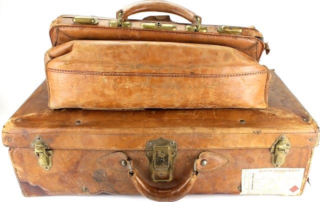 country doctors bag and old leather suitcase with various Railway Express Agency stickers and tags showing Henry Frawley's name. Est. 25-75