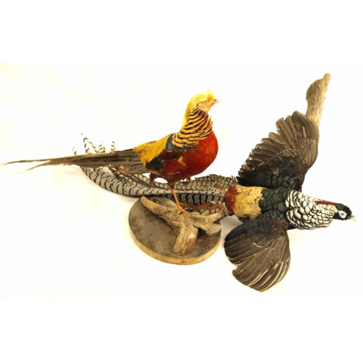 Collection of 2 nicely mounted birds includes Golden Pheasant mounted on barn wood base, 40" long with tail feathers and wall mount crossed Hi Breed 40" long with tail feathers.