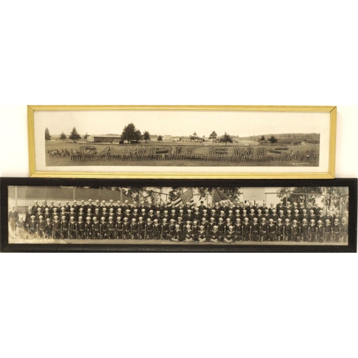 Collection of 2 original military photos include Camp Lewis the soldiers in formation spelling out "Camp Lewis" image 32" X 7' and Unmarked Navy US Soldiers, image 37 1/2' X 6 1/2'.