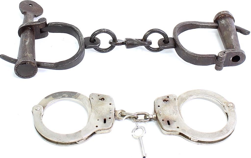 Collection of 2 pair hand cuffs includes vintage S&W with key and reproduction iron screw key cuffs.vintage S&W with key and reproduction iron screw key cuffs.