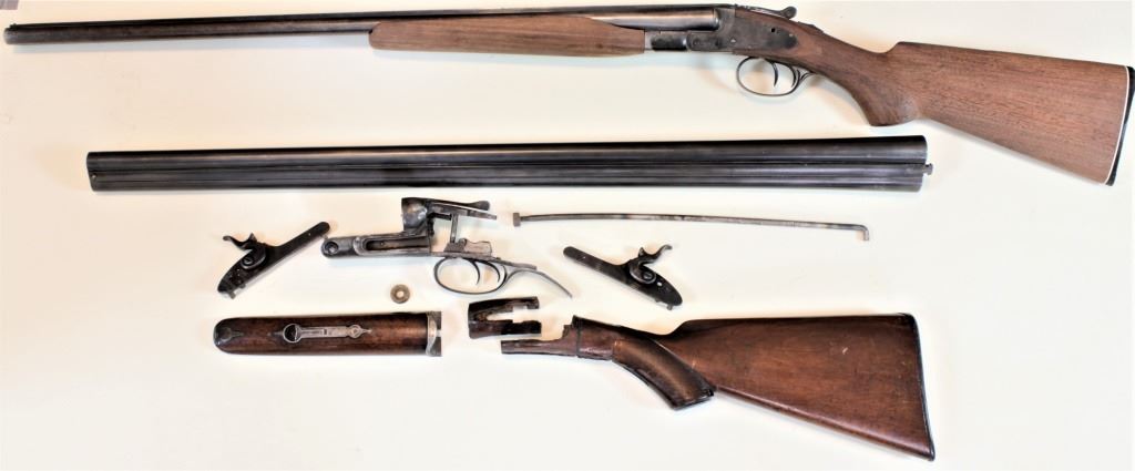 2) L.C. Smith Field Grade 20 ga. SN FWS 21561 SXS shotgun 28" barrels, non functioning actions. From old St. Louis collection. FF1) Parker Grade 2 12 ga. SN 41700 SXS hammer shotgun with 32" barrels, includes mutton leg case. 2) L.C. Smith Field Grade 20 ga. SN FWS 21561 SXS shotgun 28" barrels, non functioning actions. From old St. Louis collection. FFL/Modern. Est. 250-450