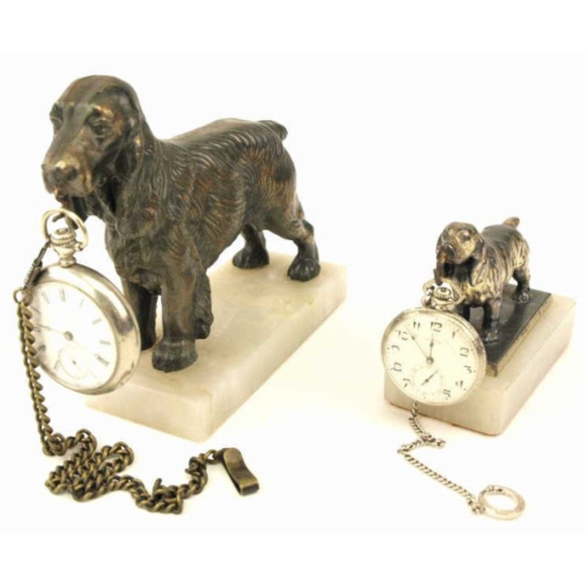 Collection of 2 pocket watch holders in the forms of Cocker Spaniels, cast metal on marble bases, 3 1/2" tall and 6" tall. Pocket watches NOT included.