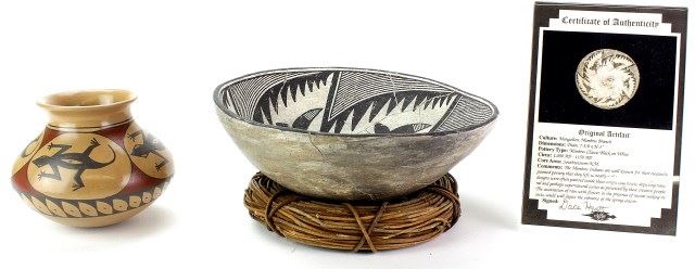 on white bowl southwestern New Mexico 1,000 AD-1150AD site repaired 3" X 7 5/8" with certificate and nicely accomplished Mata Ortiz pot signed Victor Ortiz 4" tall. Est. 175-275