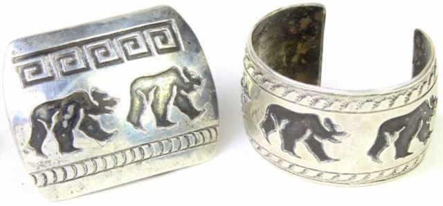 Collection of 2 signed Navajo jewelry itemssigned by Navajo artist Rosco Scott, including sterling silver cuff bracelet and a man's belt buckle, both in walking bear pattern. Est. 150-300