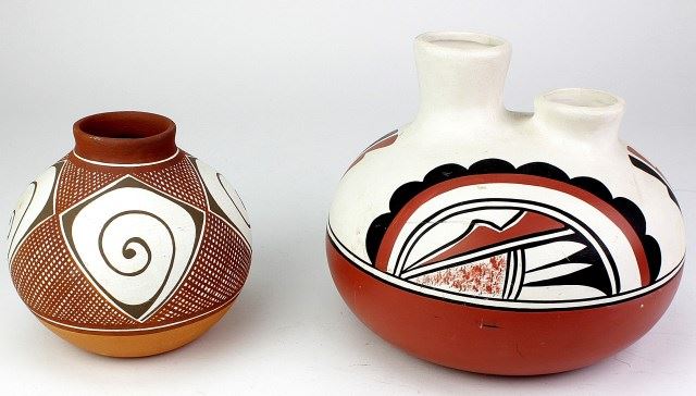 including nice double spout vessel signed L. Toya Jemez New Mexico measuring 7" tall and smaller vase measuring 5" tall. Est. 125-200
