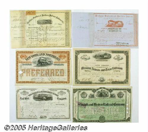 <B>Collection of 20 Different Older Railroad Stocks</B></I> Includes the following: 1. Boston & Providence Railroad, stock, Massachusetts, Rhode Island, 1893. 2. Buffalo & State Line Railroad Company, stock, New York, 1853. 3. Cleveland, Painesville & Ashtabula Railroad Company, stock, Ohio, 1856. 4. Cleveland & Toledo Railroad Company, stock, Ohio, 1863. 5. Cleveland & Toledo Railroad Company, stock, Ohio, 1854. 6. Michigan Southern Railroad Company, stock, Michigan, 1854. 7. Michigan Southern & Northern Indiana Railroad Co., stock, Michigan, Indiana, 1857. 8. Michigan Southern & Northern Indiana Railroad Co., stock, Michigan, Indiana, 1857. 9. Michigan Southern & Northern Indiana Railroad Co., stock, Michigan, Indiana, 1858. 10. Michigan Southern & Northern Indiana Railroad Co., stock, Michigan, Indiana, 1867. 11. Missouri, Kansas & Texas Extension Railway Company, stock, New York, 1880. 12. New York & Northern Railway Company, stock, New York, 1893. 13. Norfolk & Western Railroad Company, stock, New York, Virginia, 1888. 14. Oil Creek & Allegheny River Railway Company, stock, Pennsylvania, 1874. 15. Old Colony Railroad Company, stock, Massachusetts, 1893. 16. Peoria & Eastern Railway Company, stock, Illinois, 1893. 17. St. Louis, Alton & Terre Haute Railroad Company, Illinois, Indiana, stock, 1862. 18. St. Louis Bridge Company, stock, Missouri, 1894. 19. Tennessee Coal, Iron & Railroad Company, stock, Tennessee, 1884. 20. Office of the United New Jersey Railroad & Canal Company, stock, New Jersey, 1892. Great collection of 20 different railroad stocks in excellent condition. Includes some especially early and scarce types. Some especially nice for framing. Lot:253
