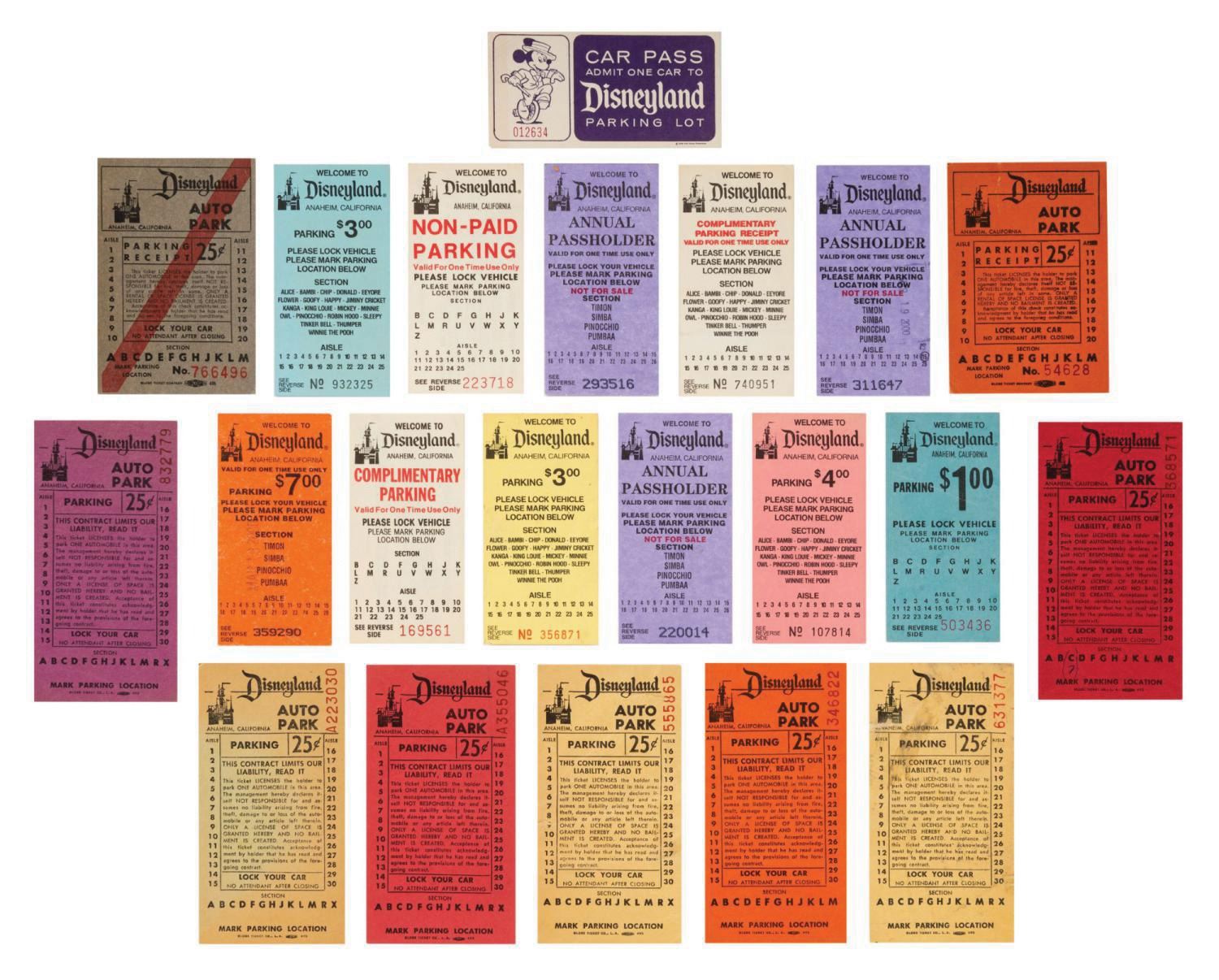(Disneyland, c.1960s-90s) A collection of (20) Disneyland Parking Lot passes spanning approximately 30 years of Park history. The passes reflect the changing prices and various developments to the Disneyland Parking Lot over the years, with the passes ranging from 25 cents to $7.00. Also included are (3) Disneyland Annual Passholder Parking Passes, (2) Complimentary Parking Receipts, and a Non-Paid Parking Pass. The largest of the passes measures 5"x2.75". The collection is in very good condition with minor handling wear.
