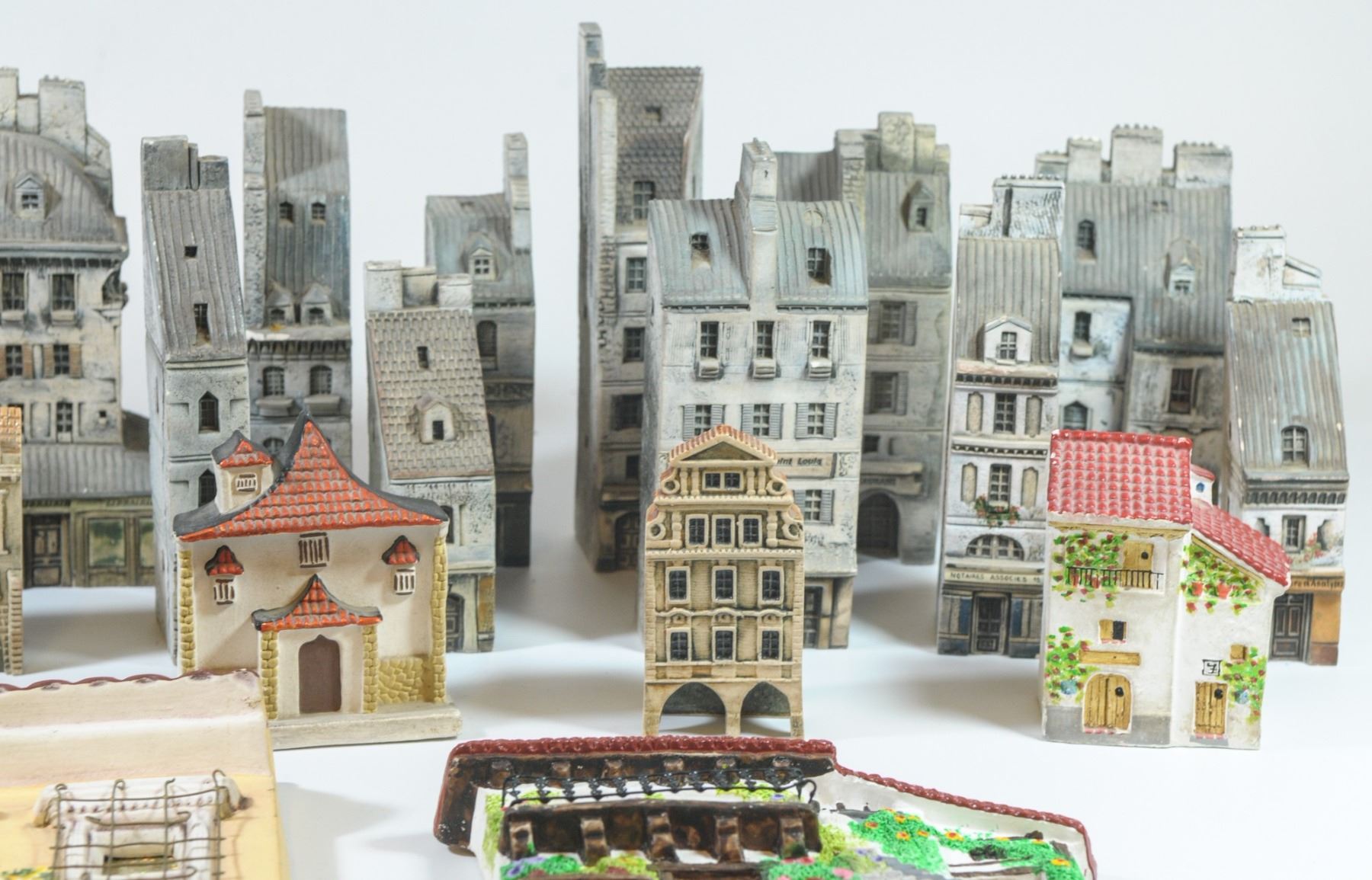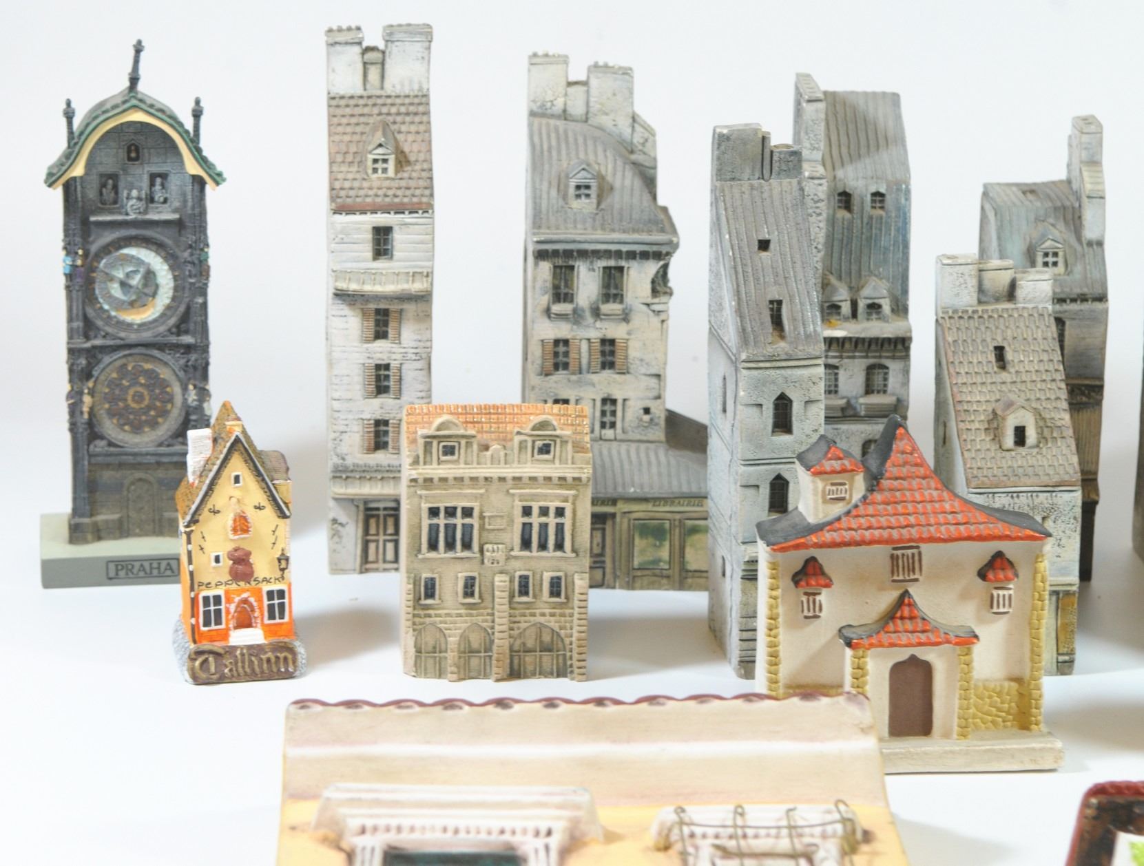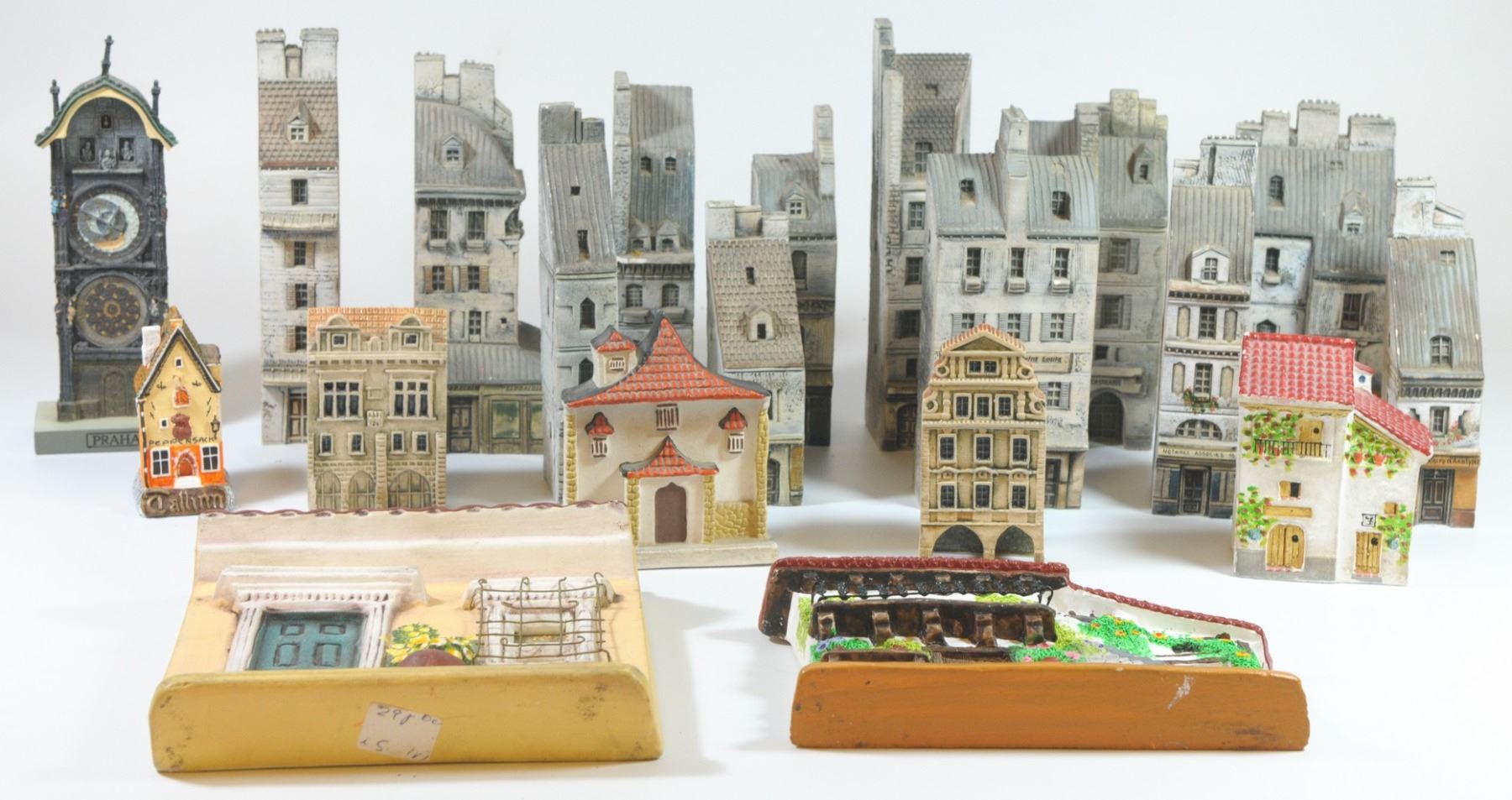 Collection of 20 house models, 12 are made of ceramic by J. P. Gault, and 8 additional house models, two of which are made of plaster and made for hanging. Height: 8-16 cm.
