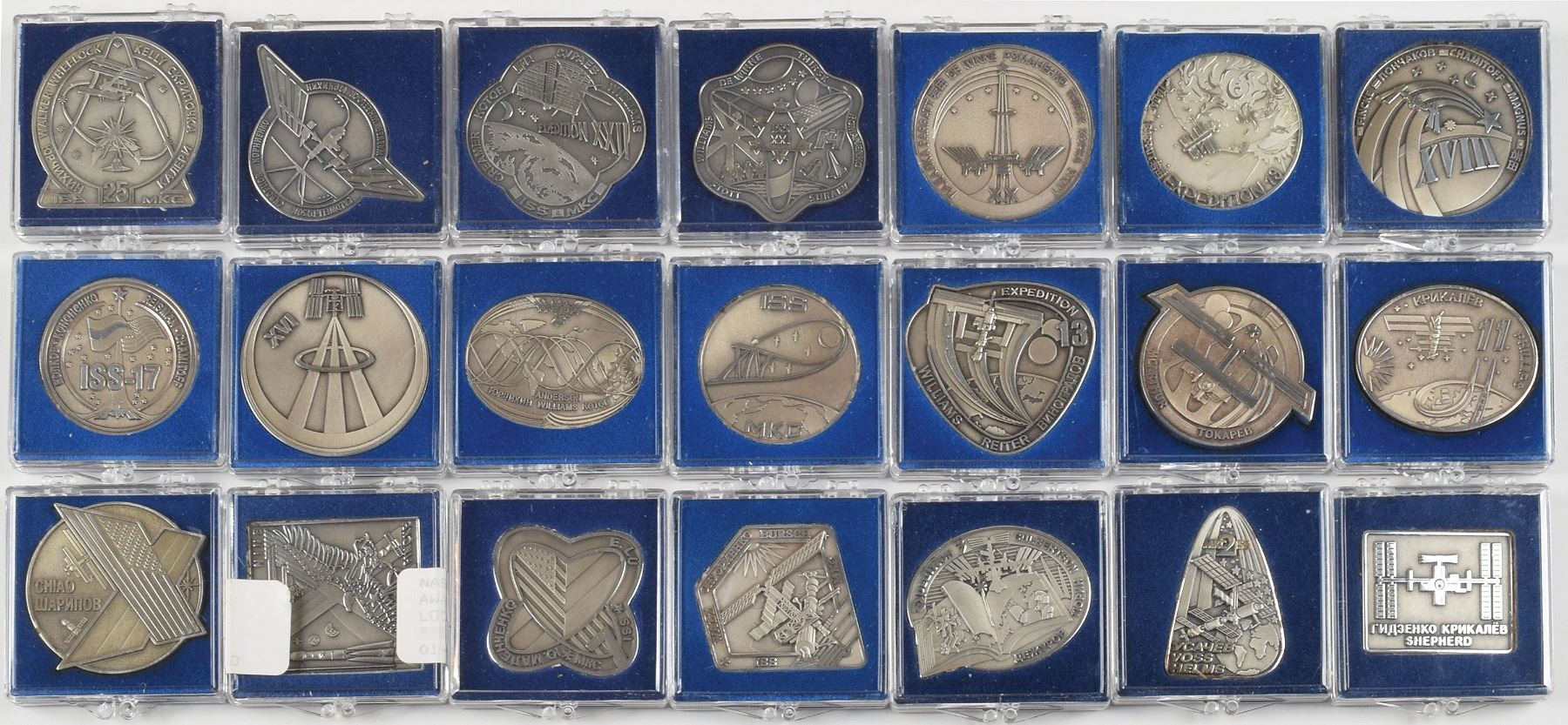 Fantastic collection of 21 unflown sterling silver International Space Station Expedition Robbins medallions, comprising the following expeditions: 1, 2, 3, 4, 7, 9, 10, 11, 12, 13, 14, 15, 16, 17, 18, 19, 20, 21, 22, 24, and 25. These ISS EXP Robbins medallions were designed by each of the crews to commemorate their missions to the space station between 2000 and 2010. The medallions generally measure between 1.5? and 2? across and feature raised mission insignia designs on the face, with the launch and return dates engraved on the reverse. All are in their original plastic cases with stiff blue felt liners, and affixed labels denoting serial numbers; also includes a larger hinged "Robbins Awards" case, measuring 11.75? x 12.5? x 4.25?. Overall condition is mint state. From the collection of a former Robbins Company executive. Robbins medals for the ISS Expeditions are quite scarce, and rarely made publicly available. A highly desirable partial set representing the first decade of the International Space Station.