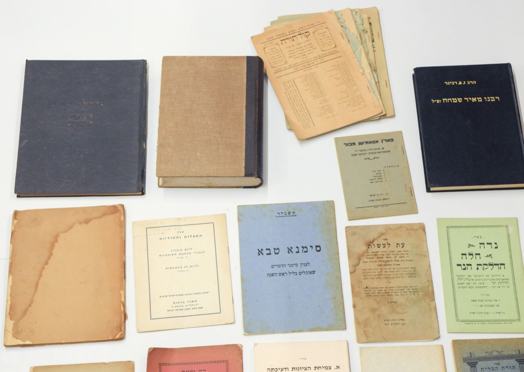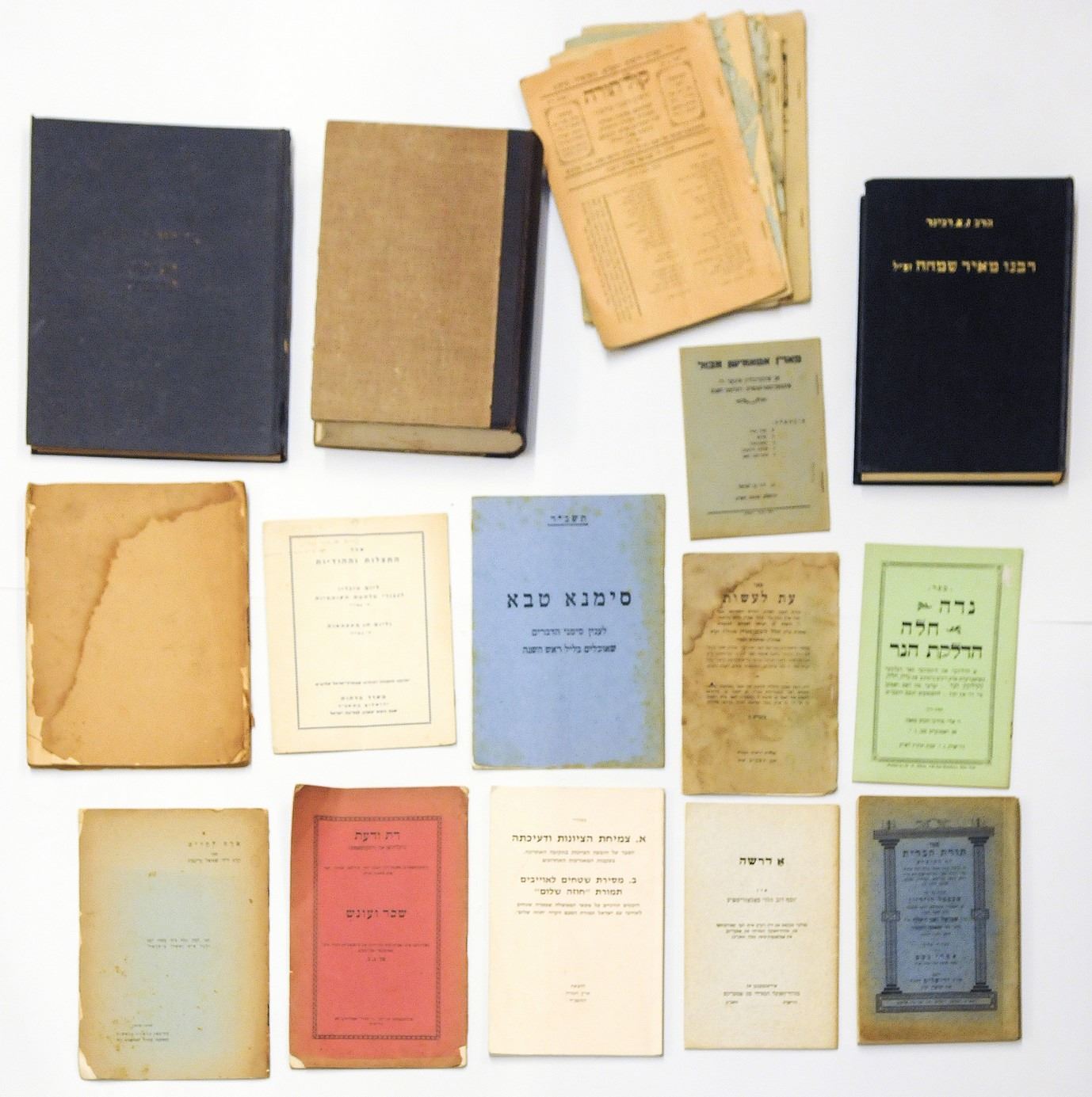 Collection of 21 Kodesh books: 1. Niddah, Challah, Hadlakat Haner: a heiliger on ... Nida, Challah, vehadlakat Haner, by Eli Mordechai HaCohen Mazah. New York, 1890. 24 pp. Paperback, in Yiddish. Very good condition 2. Kol-Torah: rabbinical monthly for halachic and aggadic matters, for Torah and Judaism and all that happens in the world of rabbis and th rabbinate in Eretz Israel and the Diaspora - edited by Shmuel Aharon Weber, Jerusalem, paperback. 6 issues: *Year II (4), booklet 7-8. Nissan-Iyar, 1935. 32 pp.; * Year III (5) - Booklet 1-2, Tishrei 1935. 32 pp .; * Year III (5) - Booklet 4, Sivan 1936. 24 pp. Good condition. 3. Simna Taba: On the Symbolism of the things eaten on the eve of Rosh Hashana - paginated by Chaim Yehuda Jacobson, Jerusalem, 1963 [revised edition]. 7 pages + 6 pages, paperback, the second part of the book contains an additional title, "Seder Brachot" (for the Rosh Hashanah Mussaf prayer). Good condition; 4. Religion and Knowledge: (Reeligian un Wissenschaft), Wisnshapatlika Aphahendlung Voggen der Idisher emuna: Far al-Klassen Iiden - Volume 4 - Sha'ar Veonesh: Bagrindt ... by B. Z. New York: Ner Tamid, 1924. 32 pages. Paperback. In Yiddish, good condition; 5. Orech Lachaim: Words for the Bride and Groom on the Day of Their Joy and to every man and woman in Israel - by Shmuel Greenberg. Tel Aviv: The Chief Rabbinate and the Religious Council of Tel Aviv and Jaffa, 1948 (3rd edition). 16 pages, paperback. Good condition; 6. Order of Prayers: The memorial day for the soldiers of the Komumiut War, 4th of Iyar and the day of Independence Day, 5th of Iyar, edited by the rabbis of Eretz Israel, Jerusalem: Ministry of Religious Affairs, 1964. 9 pages, paperback, good condition, 7. Paran Atamishan Mabul: In Ibrachalik Iberdetnantziale Veltz Lage - by David Ben Israel. Jerusalem: Horev Print, 1952, 24 pages, in Yiddish. Good condition; 8. Sefer Chomat Esh: Chidushei Aggadah al haTorah, Haftarot ... and Pirkei Avot - by Menachem A. S., David Deitsch and Meir A. S., edited by Meir Bari Greenwald. Fakash: Meir Halevi Rosenbaum Print, 1905, 71 pp, paperback. The book is written in Ktav Rashi, good condition, 9. Sefer Torat Ha-Brit: Rav hatoelet bo yevoaru inyanei mitzvot ... by Sheftel Davidson, Jerusalem: S. Weingarten Print, 1936. 53 pp, Sefer Imrei Noam: Derush veAgada... - by Shmuel Ze'ev Wolf, edited by Sheftel Davidson, Jerusalem: S. Weingarten Print, 1936. 52 pp. paperback 10. Sefer Et laasot: Kontres B - by Hillel Lichtenstein, Jerusalem, 1962. 72 pp, paperback mediocre condition, 11. Maran Rabbeinu Meir Simcha Cohen - by Ze'ev Aryeh Rebiner. Tel Aviv: Ayalon Print, 1967. 299 pp., hardcover. Photos. Good condition; 12. Mikra'ot Gedolot - Yehoshua Shoftim - Munich: Culture Department of Mizrachi Center and Torah Va'Avodah of She'erit HaPleita in Germany, 1947. 83 pp., hardcover. Good condition; 13. Alef Drasha - by Joseph Dov Halevi Soloveitchik. New York: Mizrachi-Ha-Po'el ha-Mizrachi Von Amreka, 1962. 30 pp. paperback, in Yiddish, very good condition, 14. a. The Rise and Fall of Zionism: An explanation of the recent appearance of Zionism ... b. Conceding territory to the enemy in return for a "peace treaty" ... - By Yoel Schwartz, Jerusalem: Eretz Hemdah, 1994. 88 pages. paperback. Very good condition; 15. Midrash HaGadol: On the Five Books of the Torah - Sefer Bereishit - published according to manuscripts with commentary and notes - by Mordechai Margaliot Jerusalem: the Rabbi Kook Institute next to the World Mizrachi organization, 1946, 892 pp., hardcover, additional title page in English, good condition.