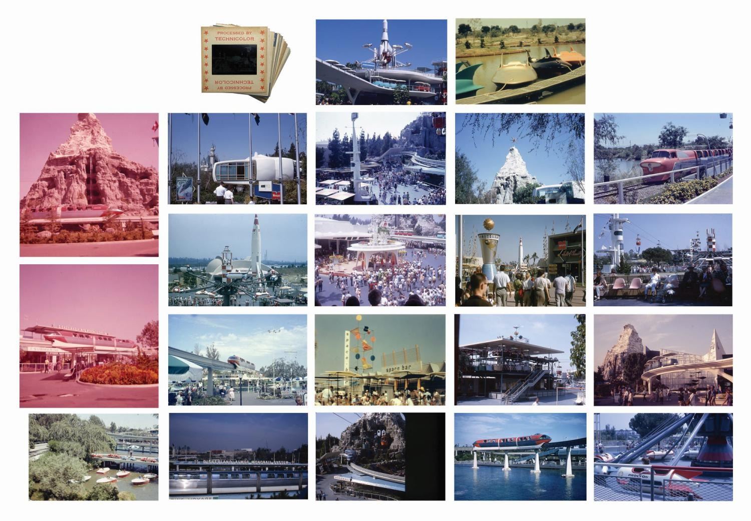 (Disneyland, c.1950s-60s) A collection of (21) slides from Tomorrowland at Disneyland. The set includes (6) slides of the Monorail, (2) slides of the Tomorrowland Skyway Bucket building, (2) slides of the PeopleMover, (2) slides of the Motor Boat Cruises, a slide of the Astro Jets, a slide of the Viewliner, a slide of the House of the Future, a slide of the Matterhorn/House of Tomorrow, and (5) slides of various attractions around Tomorrowland. Measuring 2"x2", the slides are in very good condition with minor wear from age and use, including some reddening from age on a few of the slides.