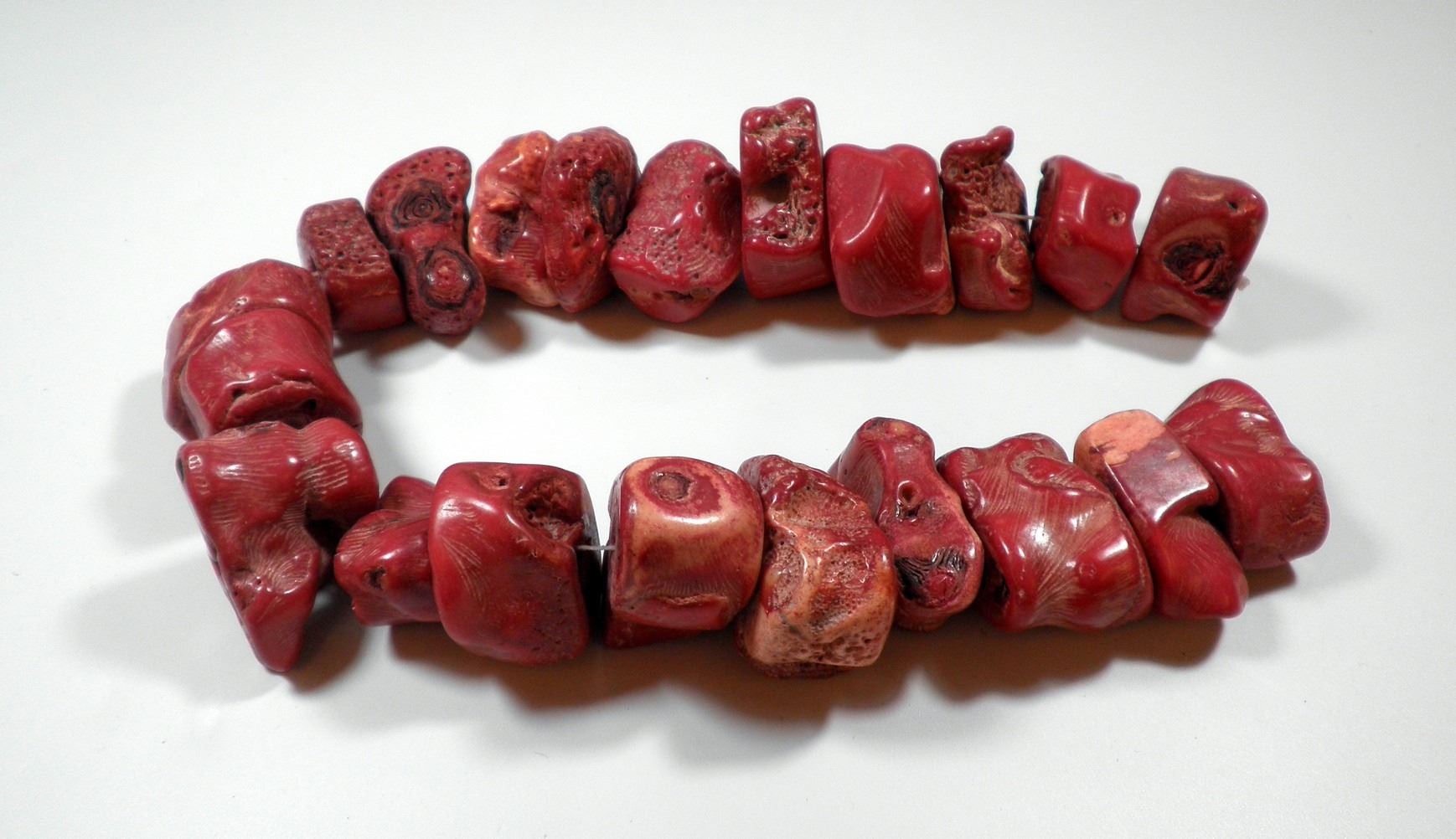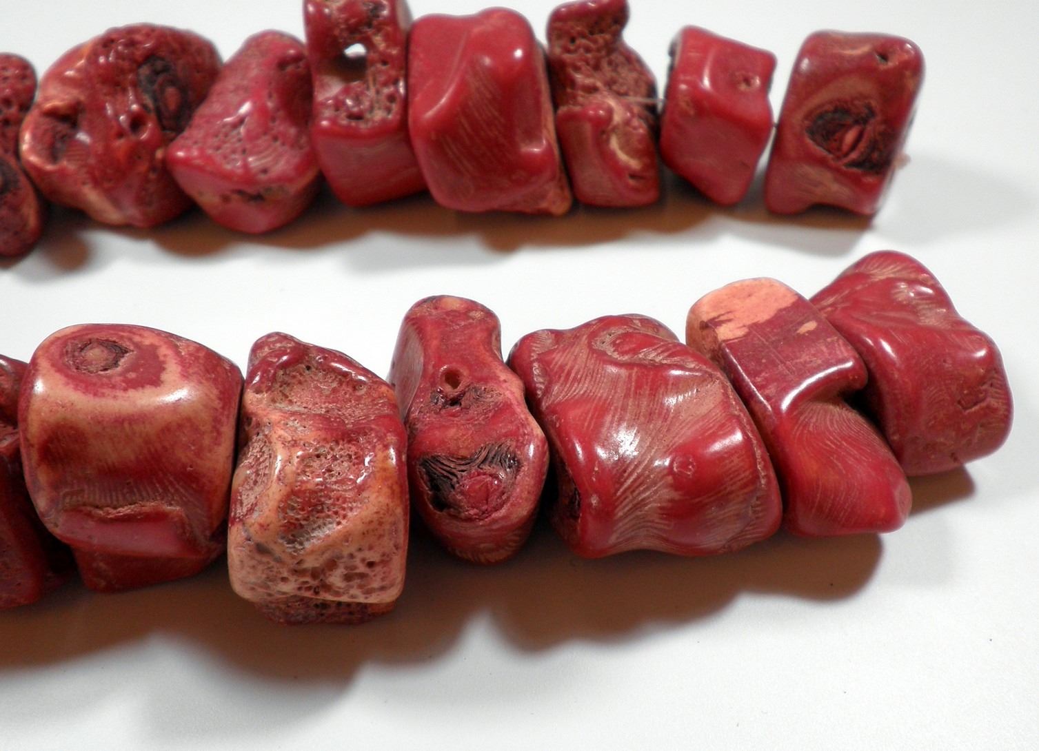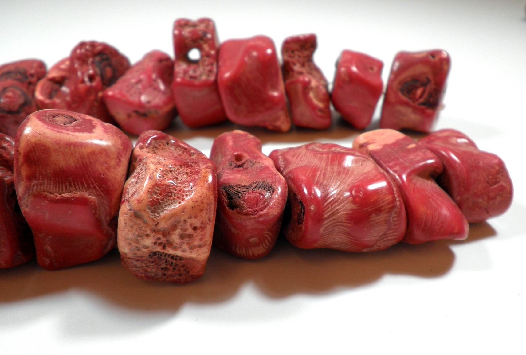 Collection of 21 coral beads on a string (no clasp), corals appear to be colored, total weight: 631 gm.