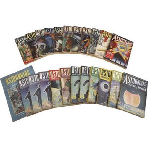 <B>Collection of 23 <I>Astounding Stories</B></I></B></I> <B>Pulps from 1936-1942</B></I> (New York: Street and Smith Publications, 1936-1942), most issues measure 6.5" x 9.25", the August 1942 issue measures 8.5" x 11.5", pictorial wrappers. The 23 issues in this assortment start at July 1936 and run through August 1942. The dates of the issues are as follows: July 1936, December 1937, November 1938, September 1938, December 1939, May 1939, September 1939, August 1939, August 1940, December 1940, November 1940, October 1940, April 1941, December 1941, January 1941 (three issues), June 1941 (two issues), October 1941, February 1941, March 1941, and August 1942. The list of science fiction authors published in this assortment of pulps reads like a sci-fi hall of fame: E.E. "Doc" Smith, L. Ron Hubbard, Clifford Simak, Ray Cumming, Eric Frank Russell, Manly Wade Wellman, A.E. Van Vogt, Jack Williamson, P. Schuyler Miller, L. Sprague De Camp, Theodore Sturgeon, Robert Heinlein (including his first published story, "Life Line" and some stories as Anson MacDonald), Lester Del Rey, Isaac Asimov, Eric Frank Russell, Nelson Bond, Hal Clement, and Lewis Padgett. All issues in very good or better condition.<BR><BR><b>Shipping:</b> Books & Catalogs (<a target="_blank" href="http://www.heritageauctions.com/common/shipping.php">view shipping information</a>)