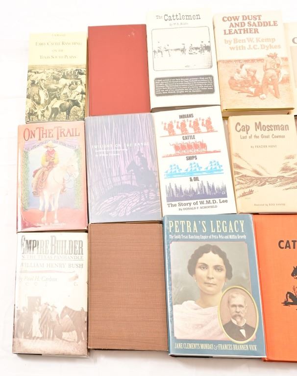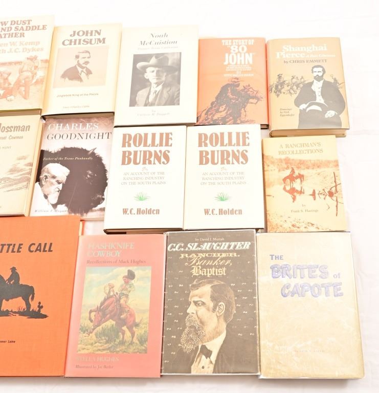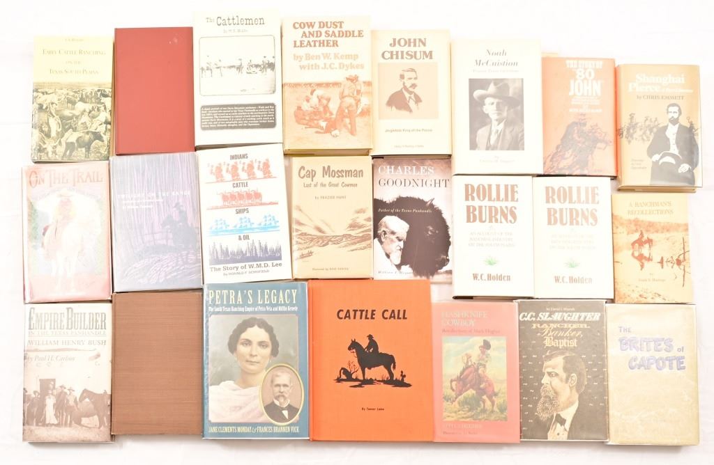 Highlights include. "the Cattleman" by W.R. McAfee, signed. "Cow Dust and Saddle Leather" 1968 First Edition. "John Chisum" by Mary Whatley Clarke, 1984 First Edition. "The Story of 80 John" Signed. Other first Editions.