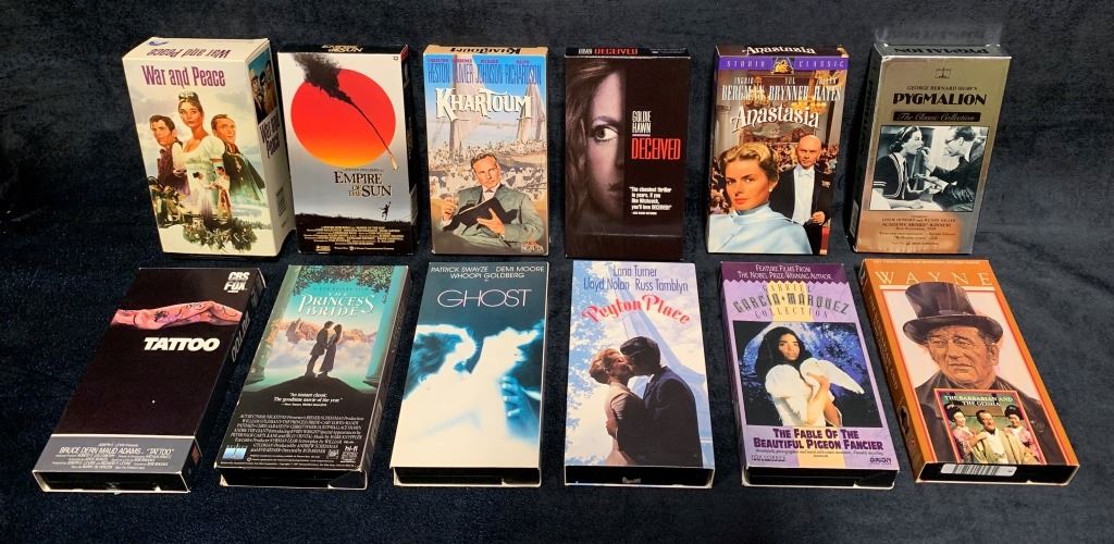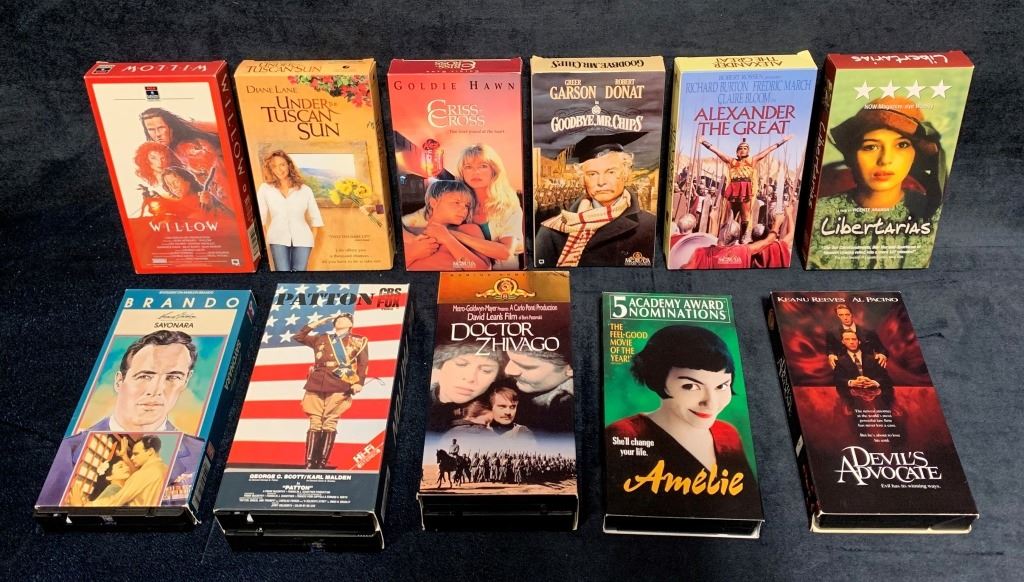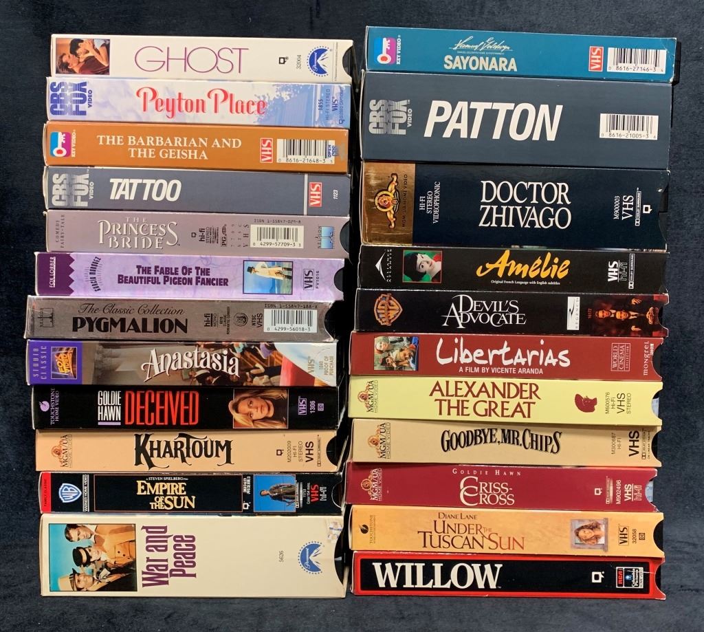 A collection of 23 VHS movies. Titles include, "Pygmalion", "The Princess Bride", "The Fable of the Beautiful Pigeon Dancer", "Amelie", "The Barbarian and the Geisha", "Tattoo", "Ghost", "Peyton Place", "Devil's Advocate', "Deceived", "Anastasia", "The Empire of the Sun", "Khartoum", "Alexander the Great", "Libertarias", "War and Peace", "Willow", "Under The Tuscan Sun", "Criss-Cross", "Goobye, Mr. Chips", "Sayonara", "Patton", and "Doctor