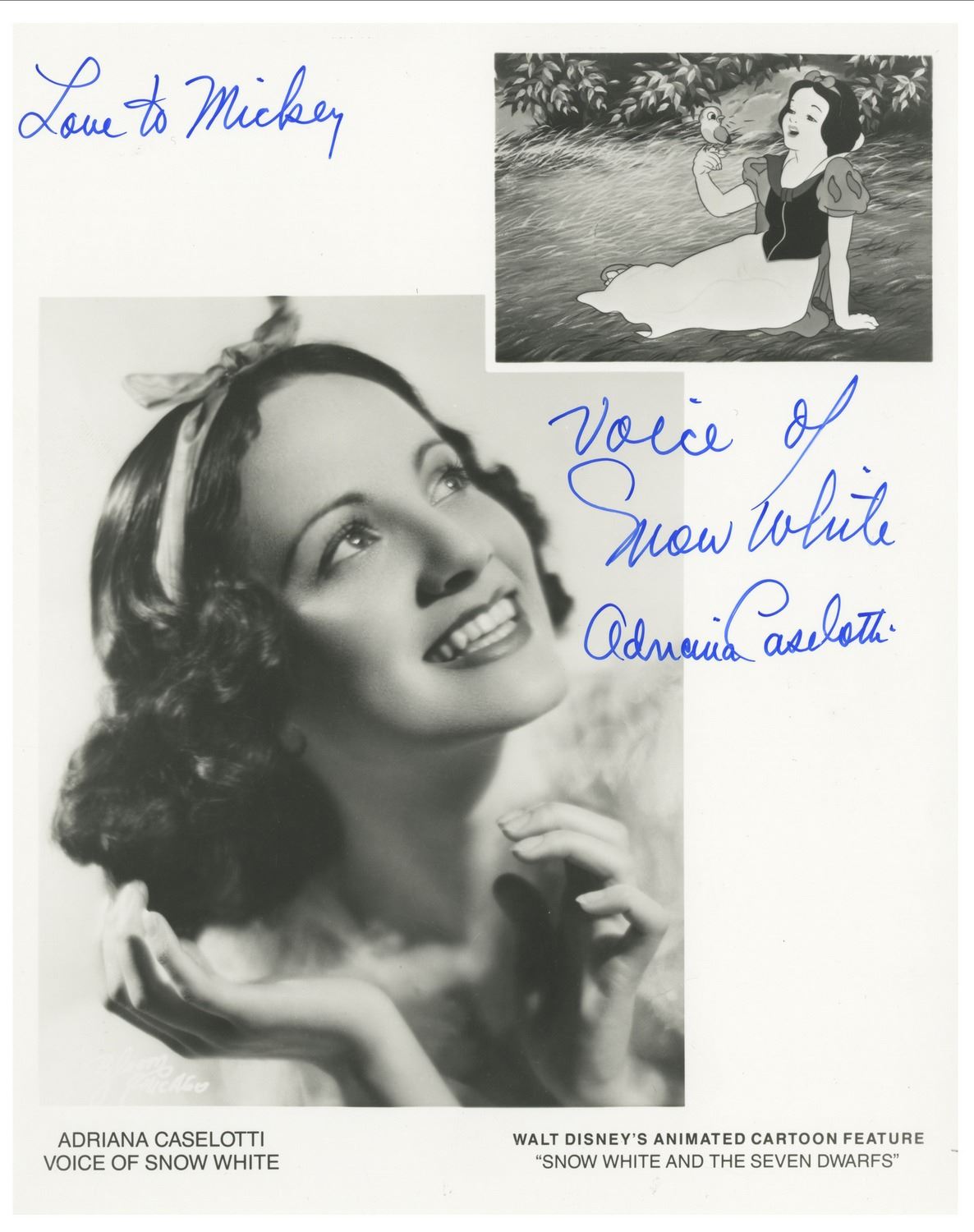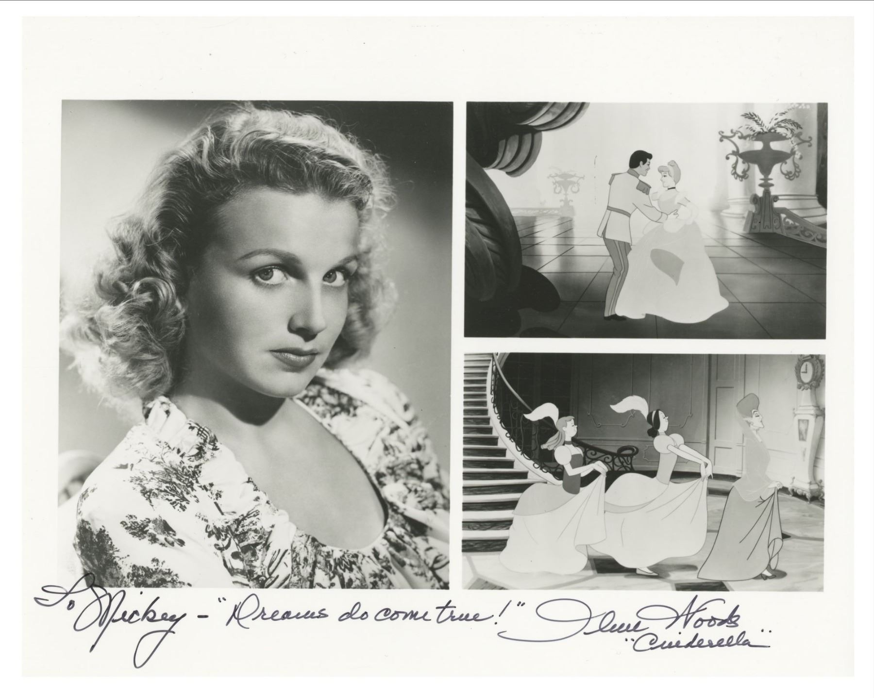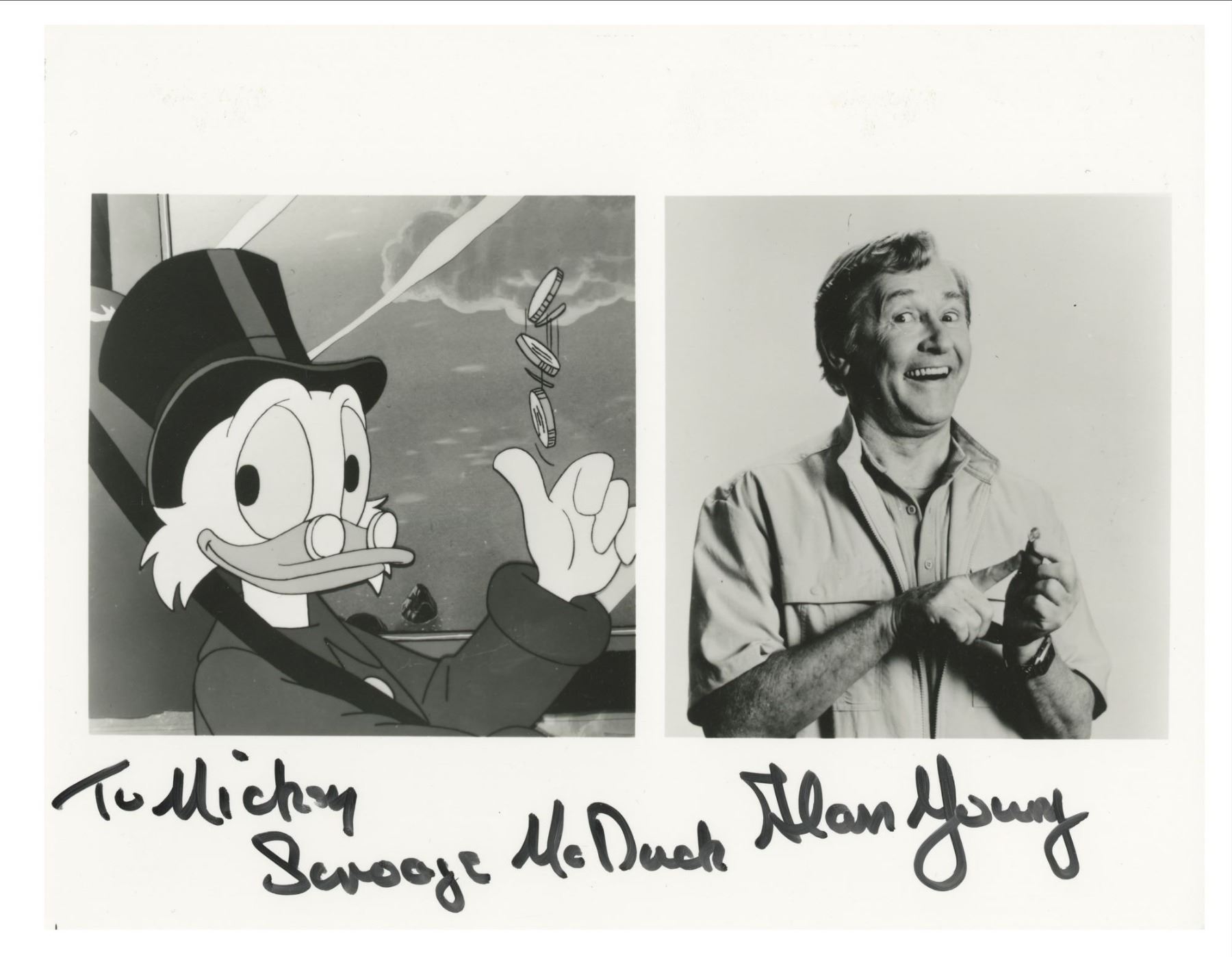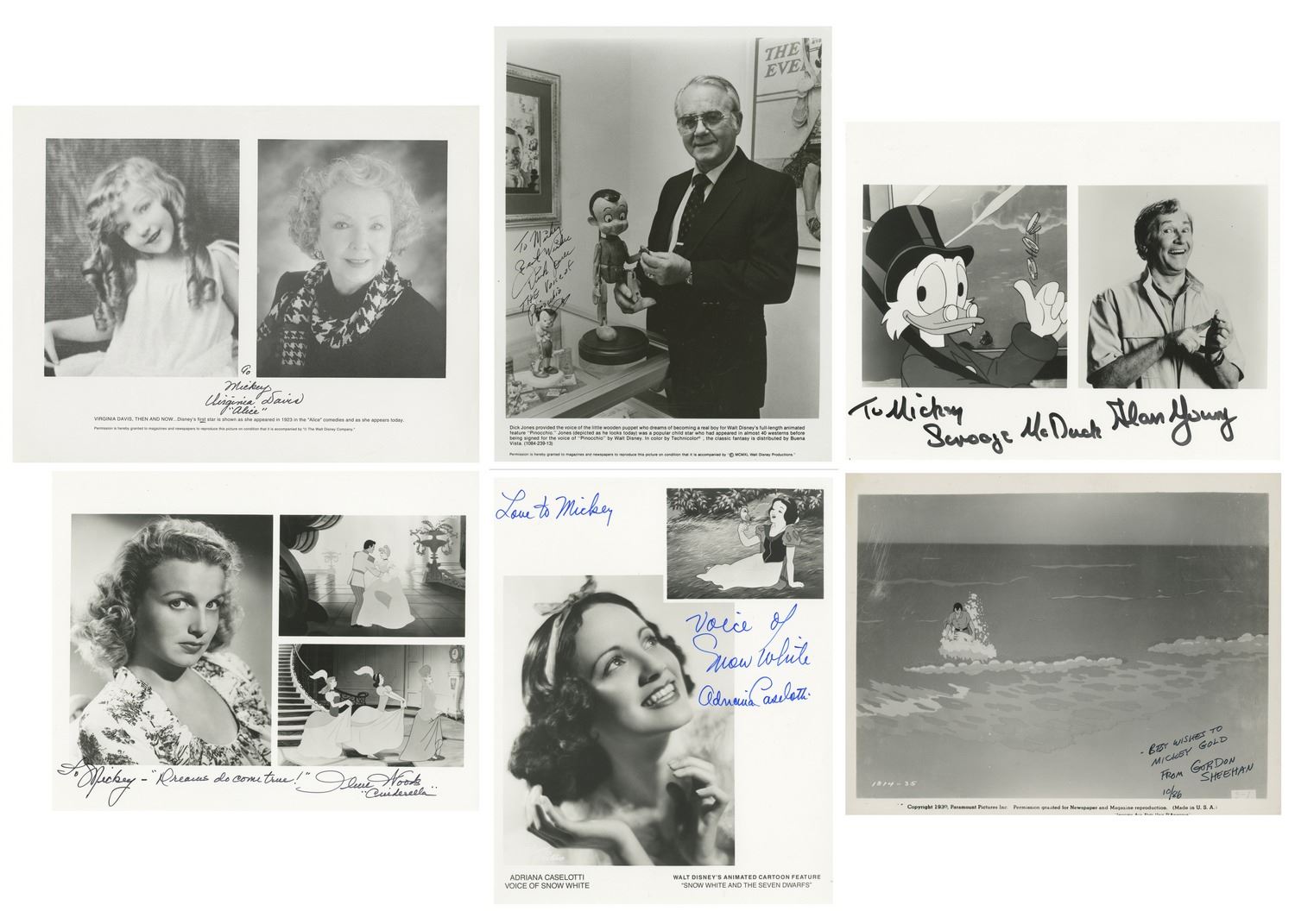 (1980s-90s) A collection of 24 signed photos from a variety of voice actors, film stars, and television stars. Some of the photographs are dedicated to "Mickey." The signatures include the voices of Smurfette, Rocky and Bullwinkle's Rocky, Judy Jetson, Scrooge McDuck, Betty Boop, and more. Some of the actor signatures include Fess Parker, Mouseketeer Karen, Mouseketeer Cubby, and more. The photos range in size slightly but are approximately 8.5"x11". The photos are in very good condition with little wear.