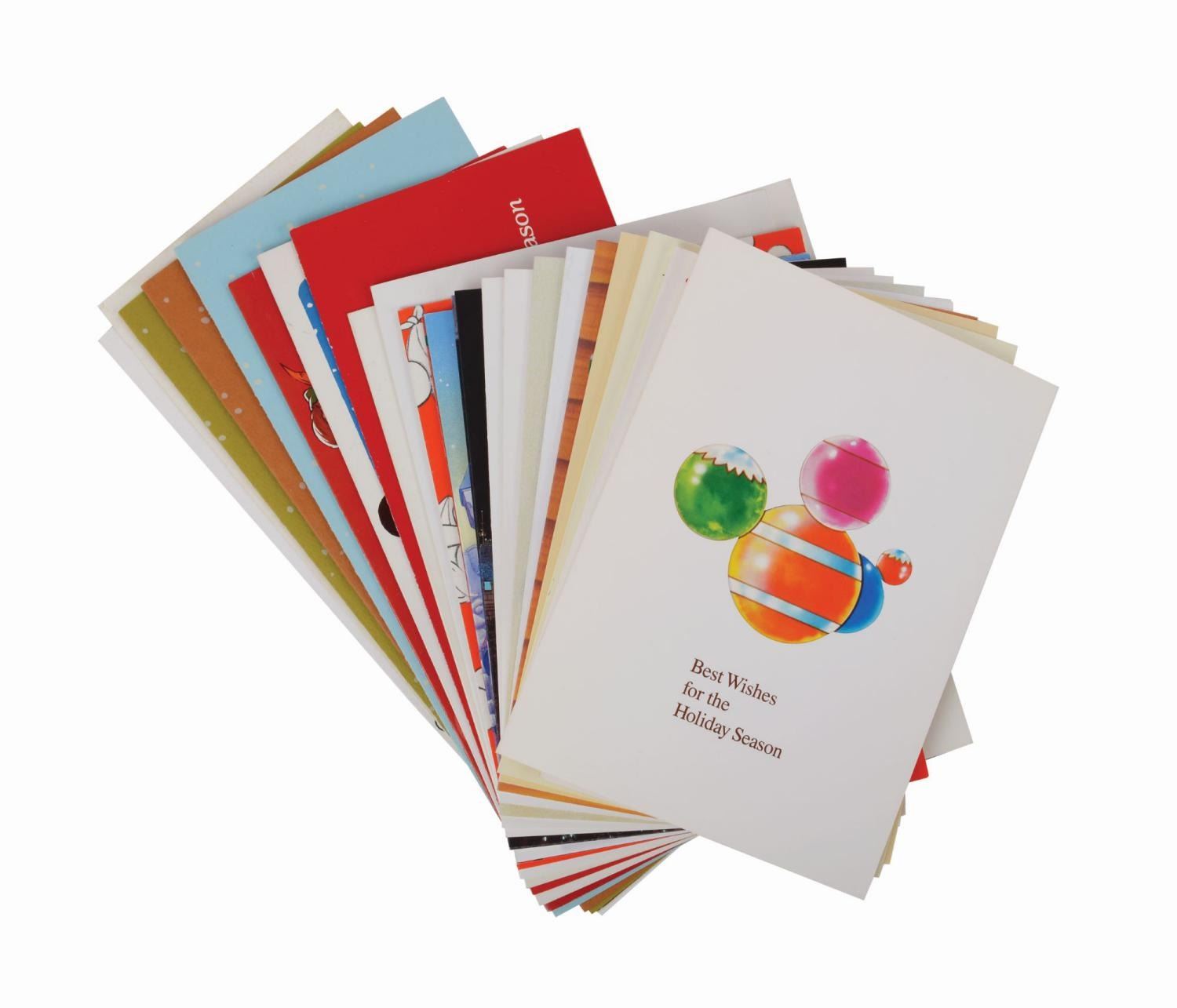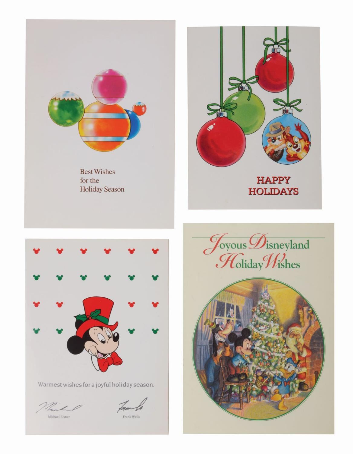 (Disneyland, 1970s-2000s) A collection of (25) holiday cards sent by Disneyland and Walt Disney Productions exclusively to Cast Members and employees. The cards all feature a festive illustration or photo featuring Disney Characters or Park icons on the cover and an interior message of good cheer. The set includes cards dated: 1974, 1975, 1977, 1978, Mickey Mouse 1978, 1980-1982, 1987, 1988, 1989, 1995, 1997, It's a Small World Holiday 1997, 1998, It's a Small World Holiday 1998. Nine of the cards are undated. Ranging in size from 4"x9.75" to 6"x7.75", the collection is in generally very good condition with some toning, soiling, and handling wear.