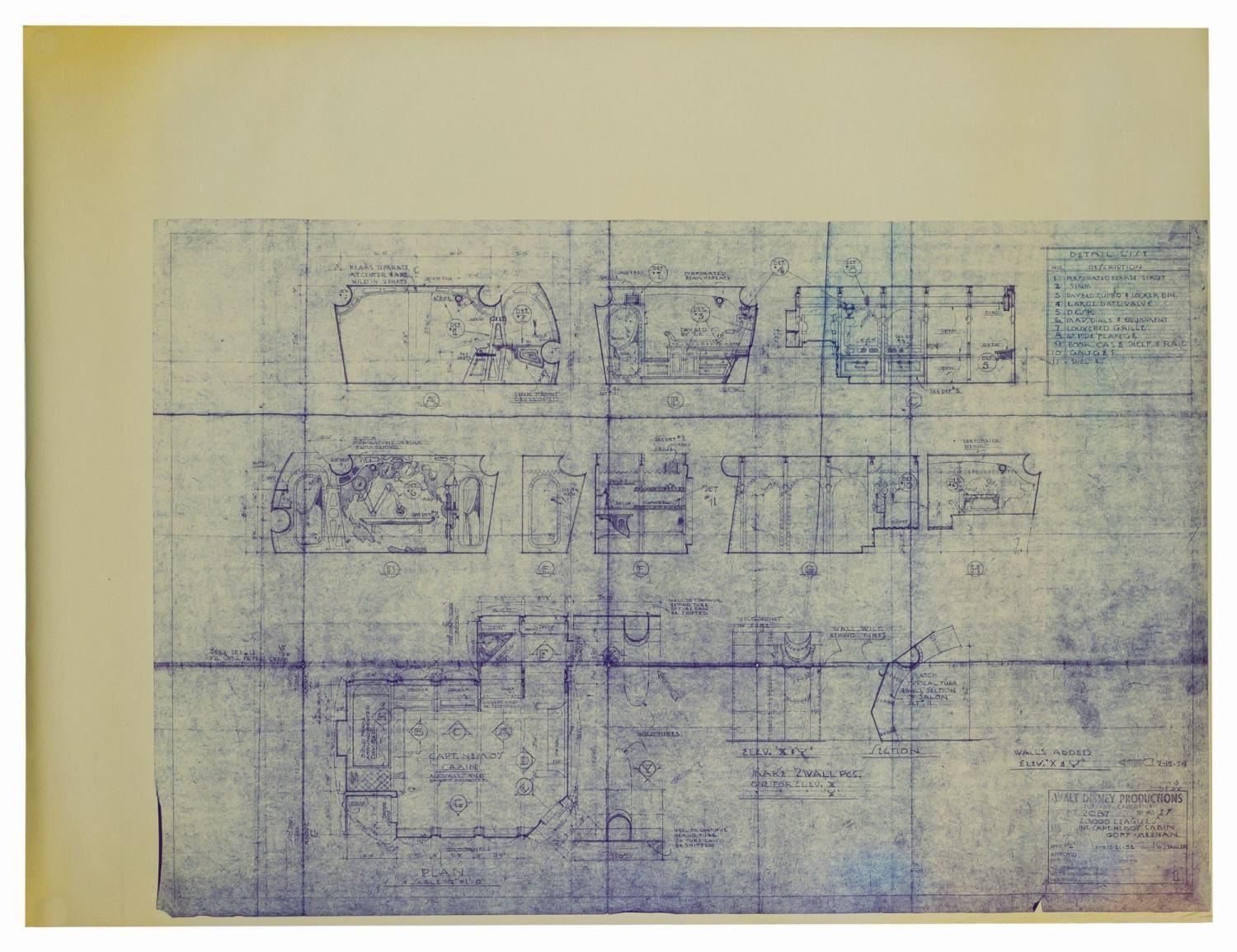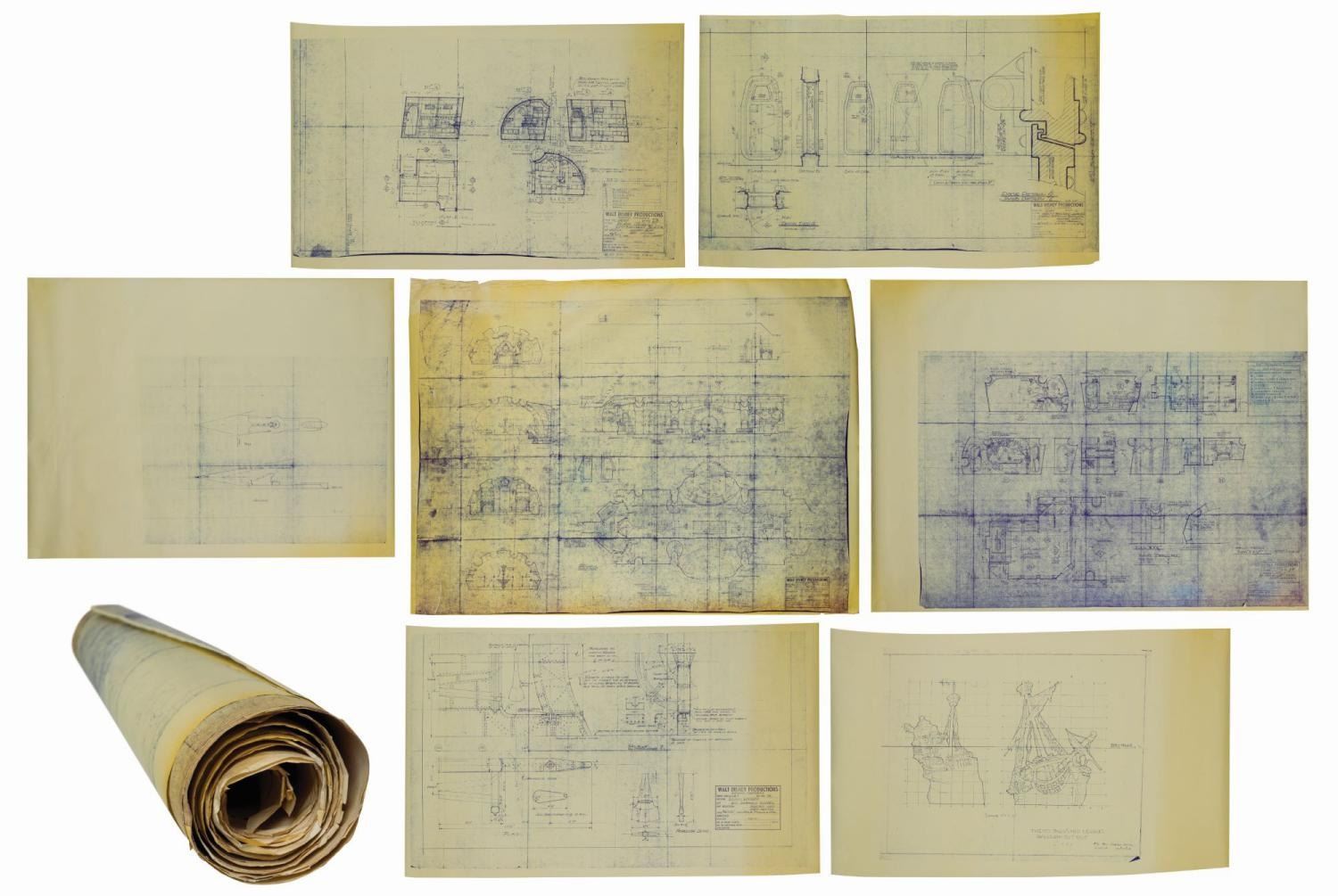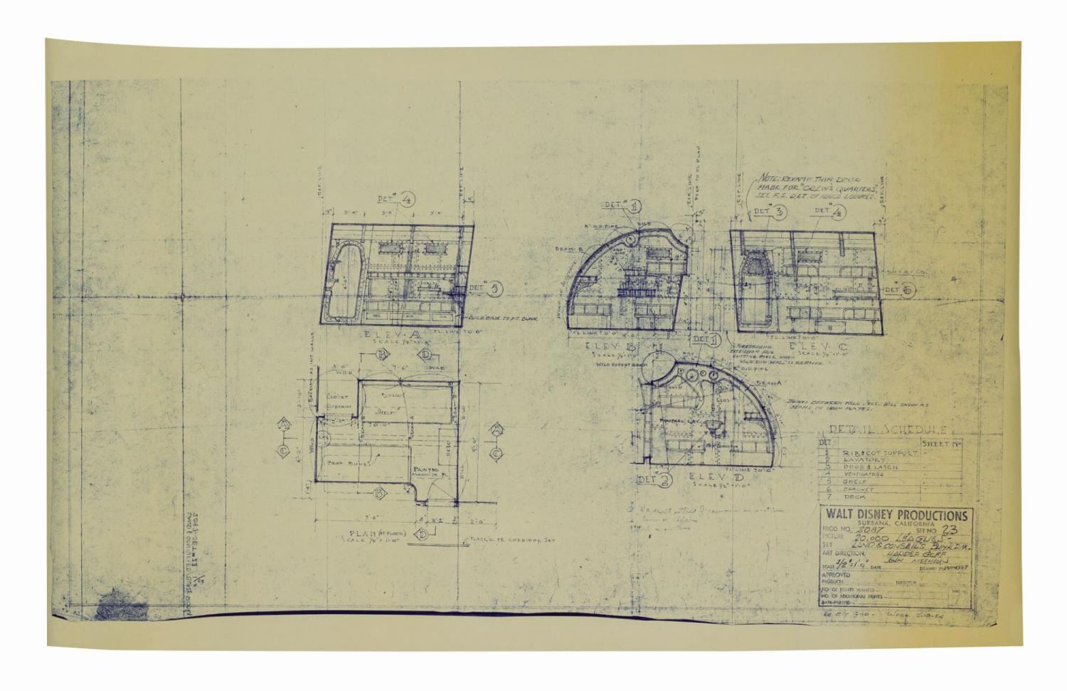 (Disney, 1953-54) A collection of (26) blueline prints showing interior and exterior set design from the feature film 20,000 Leagues Under the Sea. Among the locales included are Captain Nemo's cabin, the salon, the crew cabins, the pump room, Aronnax's cabin, and several exterior diagrams. These incredible bluelines capture not only the overall layout of the rooms, but also more detailed design elements which make the look of this iconic film so memorable. Harper Goff and John Meehan are credited as art directors in the project legends. Ranging from 22.25"x36.25" to 42"x56", the bluelines are in very good condition with expected wear from age and use. Most show discoloration along the edges where the paper was exposed to sunlight, and many have wrinkling and creasing to the page along one edge. There is some general edge-wear, and one print has an approximately 4" tear at the upper right, and there is some warping to the pages throughout from age.