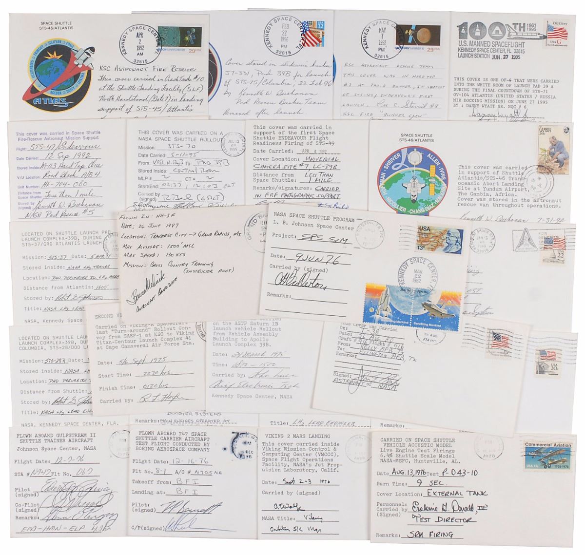 Collection of 26 postal covers carried in some capacity during various NASA activities, each identified in type and signed by various NASA personnel and employees, including three signed by astronauts or astronaut candidates, including C. Gordon Fullerton. Carried on activities such as rollouts and test flights, or located on launch pads and important rooms. In overall very good to fine condition. The Leon Ford Collection.