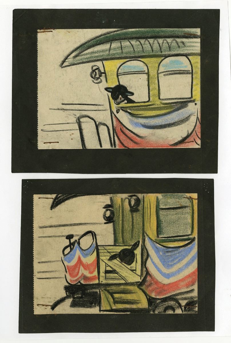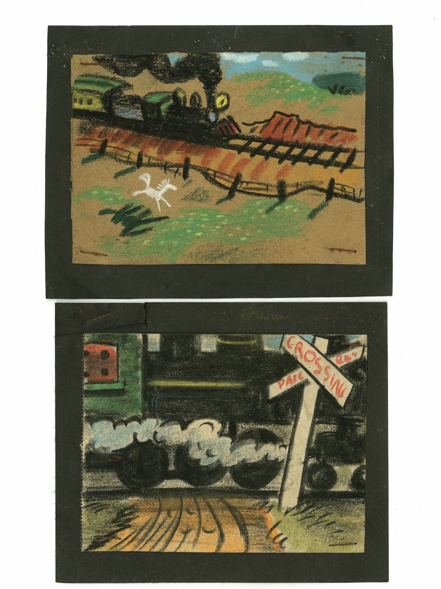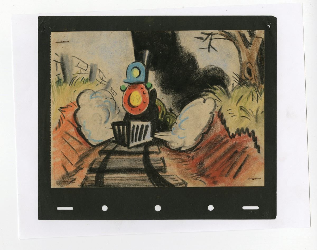 (Walt Disney Studios, 1949) Amazing collection of (27) original storyboards by the Legendary Bill Peet. Accomplished in pastel on storyboard paper, the artwork is for a train sequence most likely cut from the final film. The sizes for each storyboard range from 5"x6" to 7.75"x9". In fine condition overall with some wear.