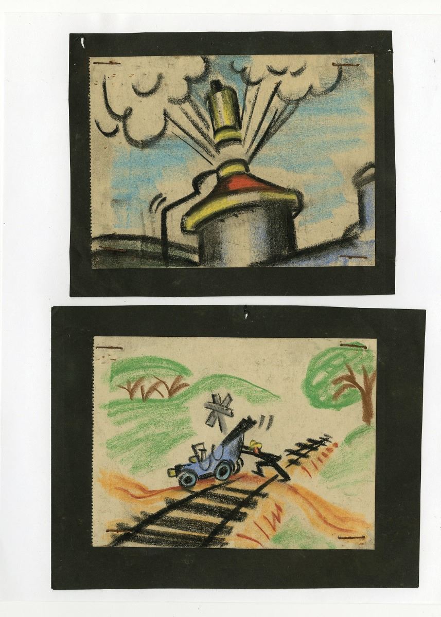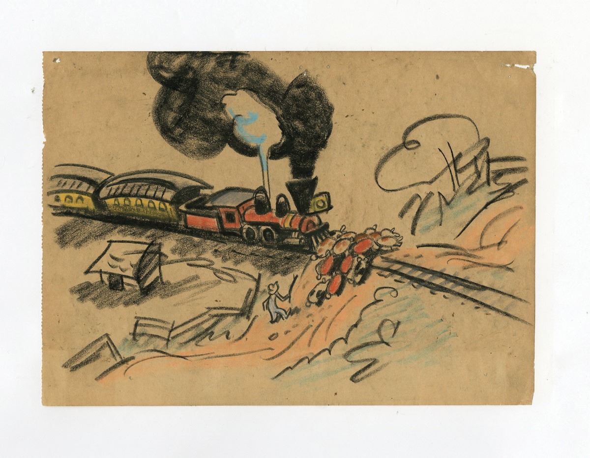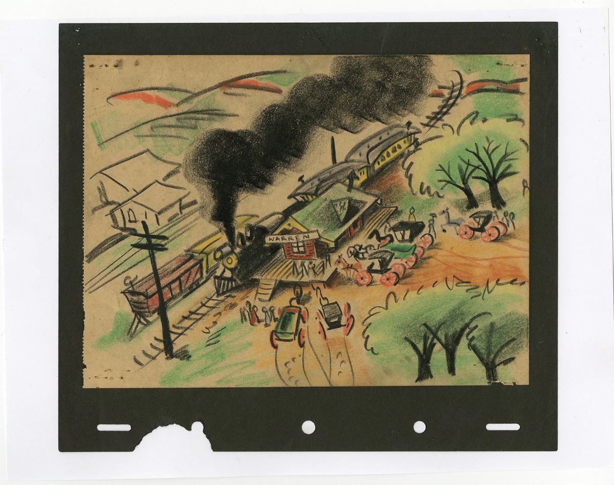 (Walt Disney Studios, 1949) Amazing collection of (27) original storyboards by the Legendary Bill Peet. Accomplished in pastel on storyboard paper, the artwork is for a train sequence most likely cut from the final film. The sizes for each storyboard range from 5"x6" to 7.75"x9". In fine condition overall with some wear.