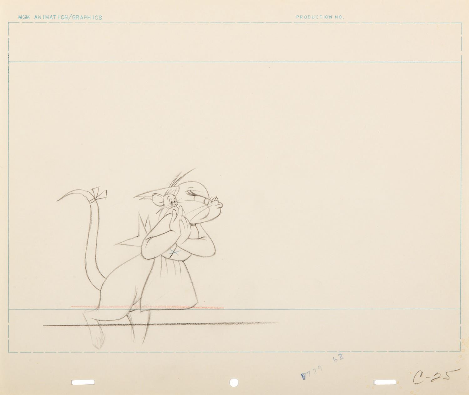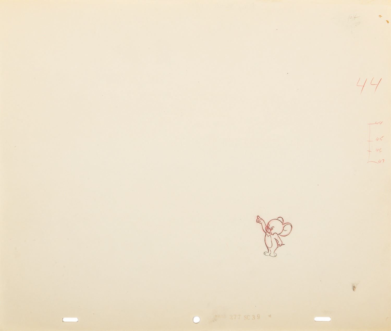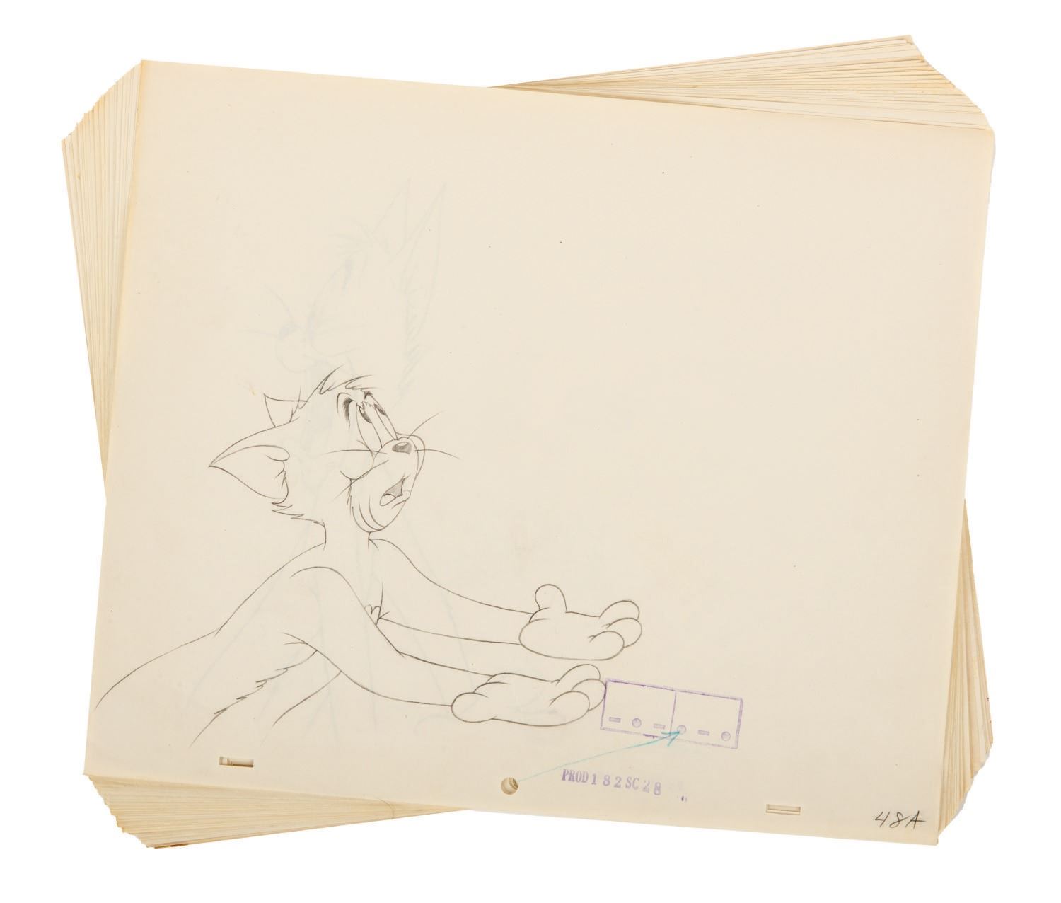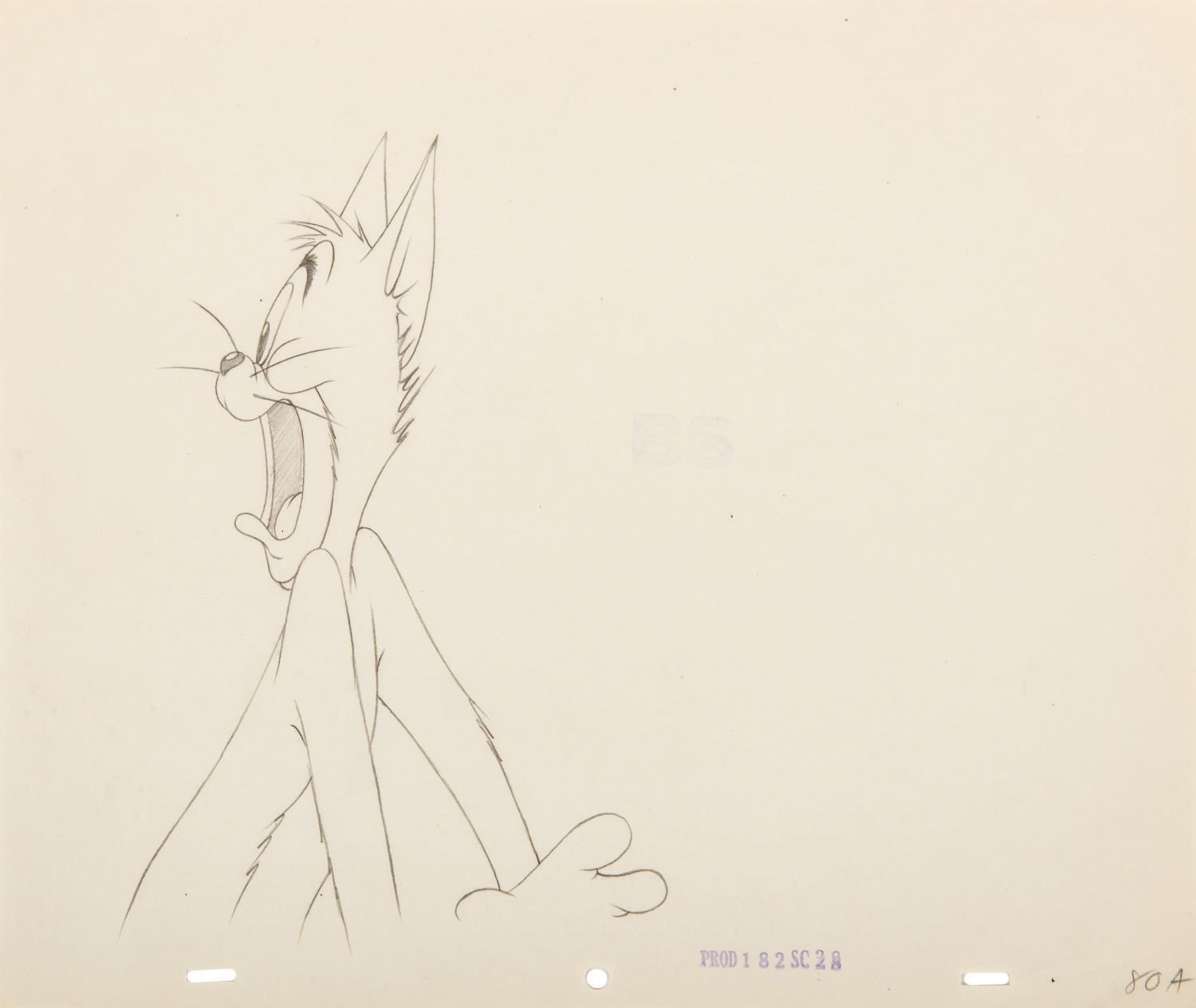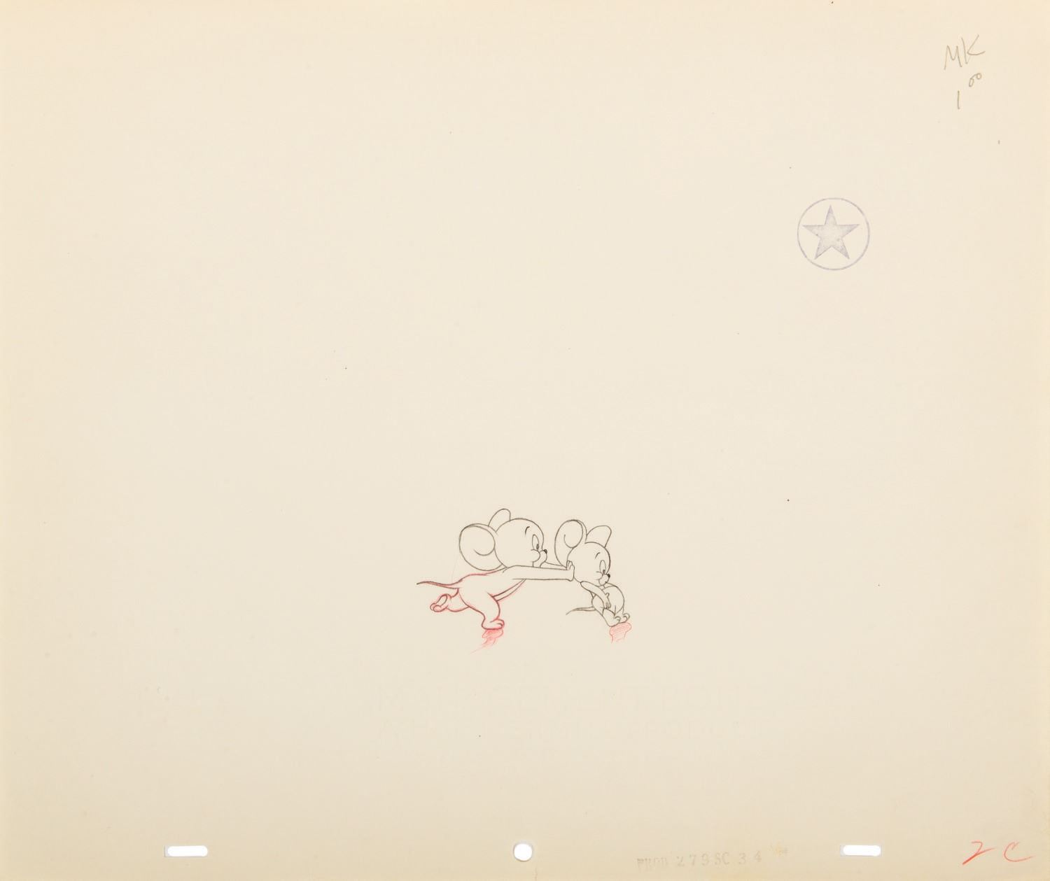 (MGM, 1950s/60s) A collection of (27) drawings used in the production of Tom and Jerry short films. Among the artwork are drawings of Tom, Jerry, Nibbles, and Toodles Galore, the latter used in the production of "Love Me, Love My Mouse." The Drawings come from both the Hanna and Barbera MGM years as well as the later Chuck Jones era. Measuring approximately 10.5"x12.5", the drawings have an image size ranging from 7.5"x9" to 1.5"x1.5" on their 10.5"x12.5" animation paper. Each piece retains some annotation used in production and displays in very good overall condition, exhibiting some wear to edges and corners.