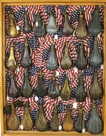 Collection of 27 zinc and copper powder flasksantiques, mounted on display board, condition rates good to near fine, all complete with working shut offs, and identified with corresponding numbers to "The Powder Flask Book" by Ray Riling, an impressive displaywith book included. From John Hunter collection. Est. 1500-3000