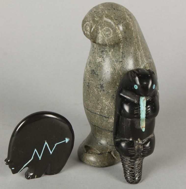 Including: 1 green stone Alaskan owl measuring 5" overall, 1 wooden beaver carving with turquoise eyes and fish, and 1 obsidian bear effigy with turquoise inlay.