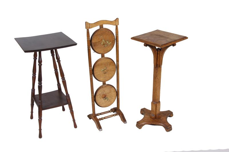 Collection of 3 Antique Plant Stands 1- square top oak stand measures 31"H, 1- mahogany stand with spindle legs measures 31"H, and 1- 3 shelf folding stand measures 37"H.1- square top oak stand measures 31"H, 1- mahogany stand with spindle legs measures 31"H, and 1- 3 shelf folding stand measures 37"H.