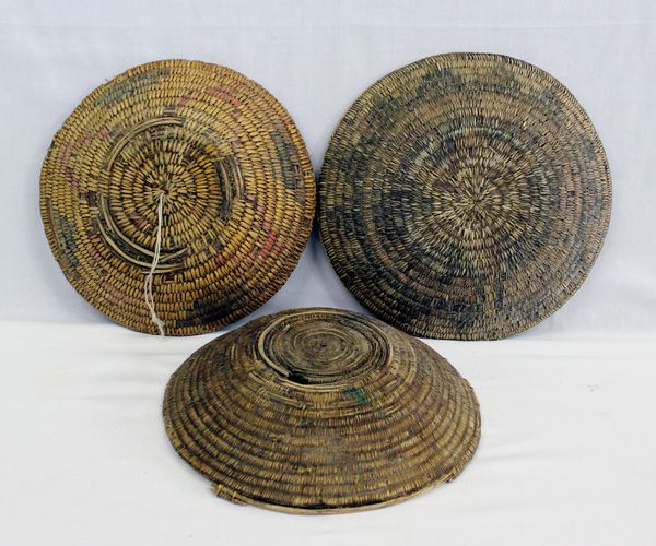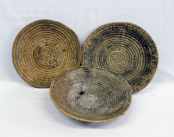Collection of 3 Antique Wedding Baskets. These wonderful basket show wear around the edges and one has a hole in the middle which is understandable for their age. They measure: 12''Diameter x 2.5''H, 12.75''Diameter x 2''H, and 12''Diameter x 2.5''H.