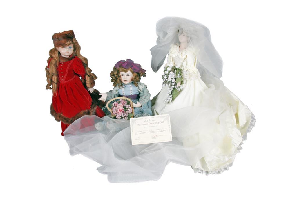 Collection of 3 Bisque Headed Dolls Including one "Princess Diana Bride Doll" with certificate of authenticity by Danbury Mint.Including one "Princess Diana Bride Doll" with certificate of authenticity by Danbury Mint.