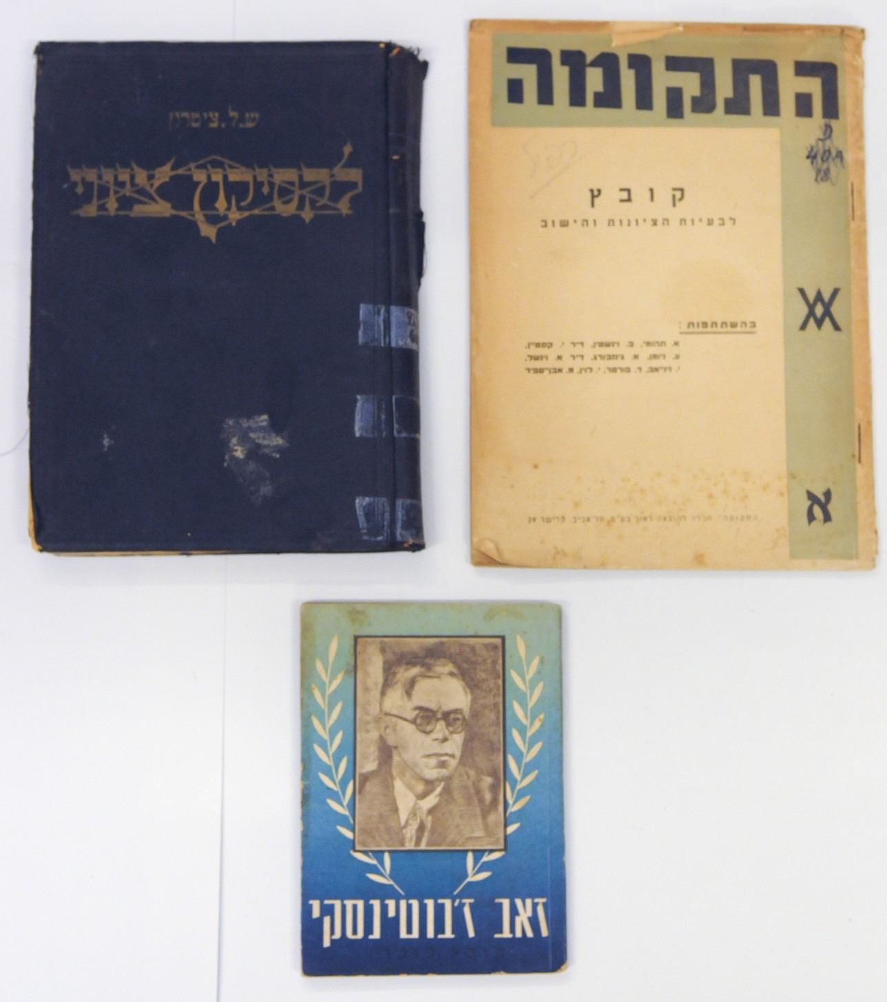 Collection of 3 Books on Zionism: 1. Hatkumah: A Selection of Problems of Zionism and the Yishuv - Tel Aviv: Hatkumah, 1939. 43 p. Paperback. Former library copy. Good condition; 2. Ze'ev Jabotinsky: A Collection in His Memory - edited by A. Ramba. Tel Aviv: Shilton Beitar, 1948 144 p. Paperback. Paintings, Photograph. Good condition; 3. Zionist Lexicon: The History of Prominent Zionists with their pictures - by S. L. Citron. Warsaw: S. Shevrak, 1924. 824 pages [each page is divided into two columns, each numbered as a different page], hardcover, drawings, photographs, former library copy. Good condition.
