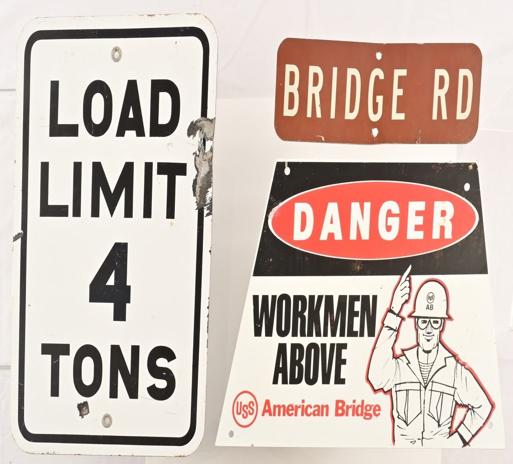 "Bridge Rd" aluminum sign 4" x 12". "Danger Workman Above" aluminum sign 12" x 18". "Load Limit 4 tons" porcelain sign 12" x 18".