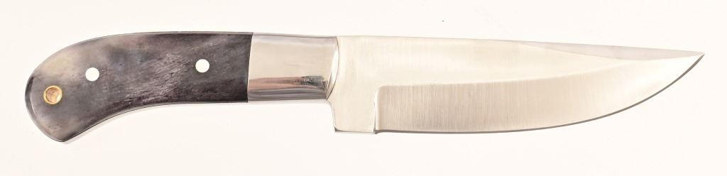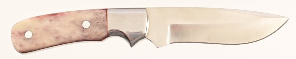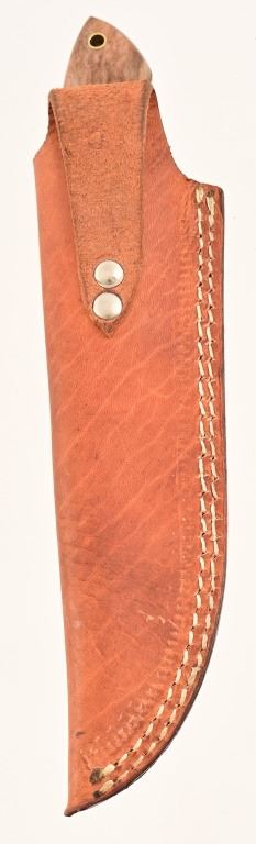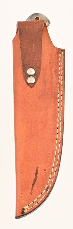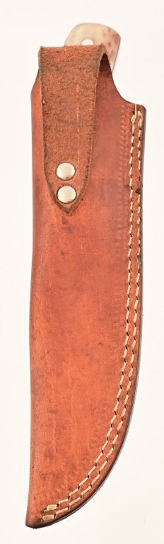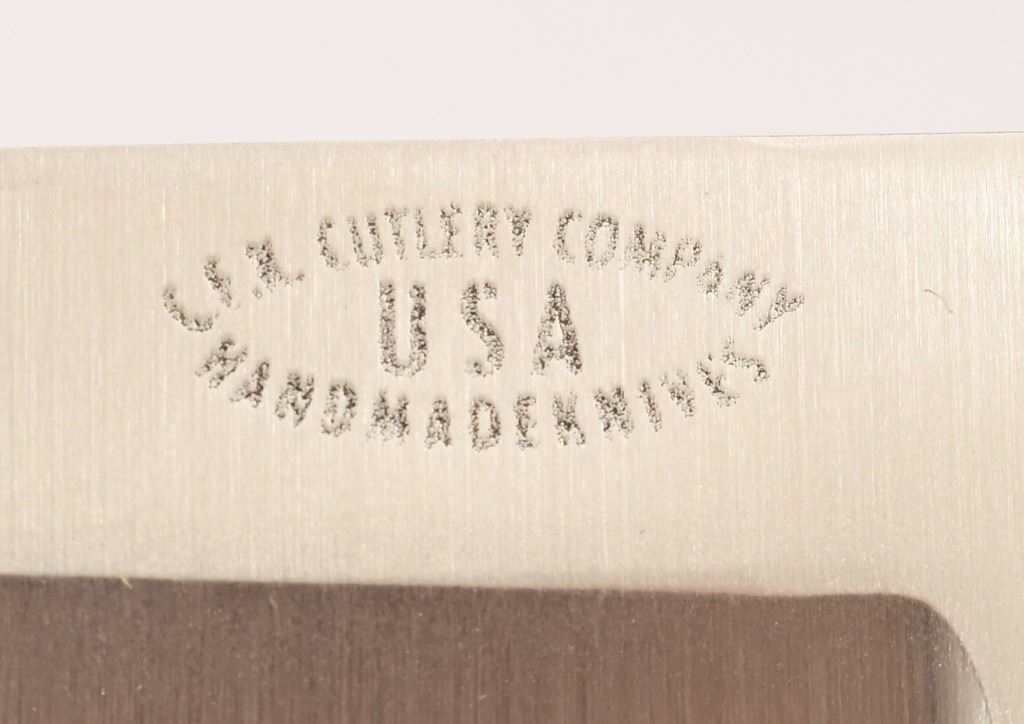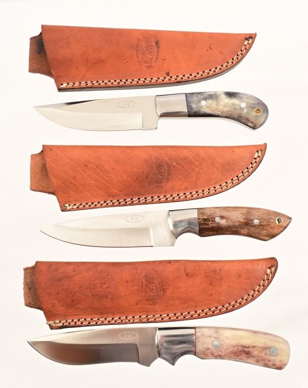 All have 5" stainless blades with stainless bolster, dyed bone handles, 9" overall length, with CFK Cutlery stamped leather sheaths.