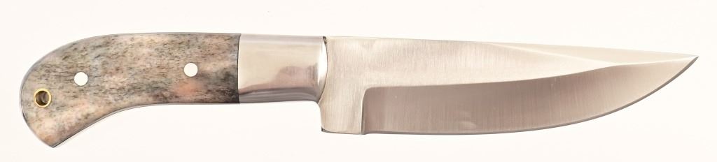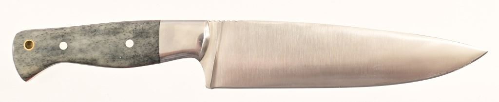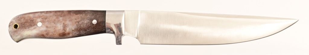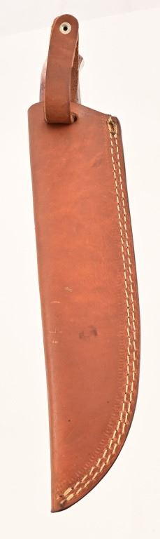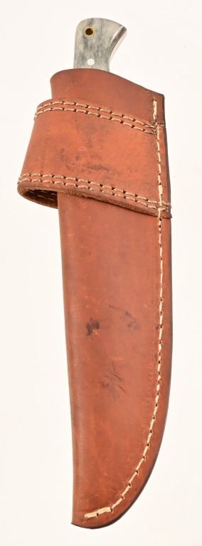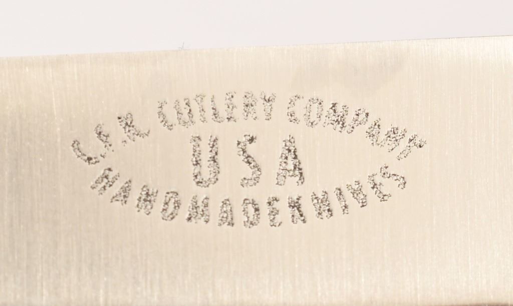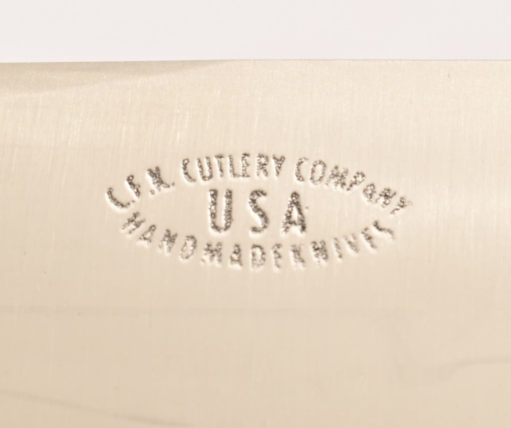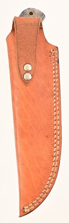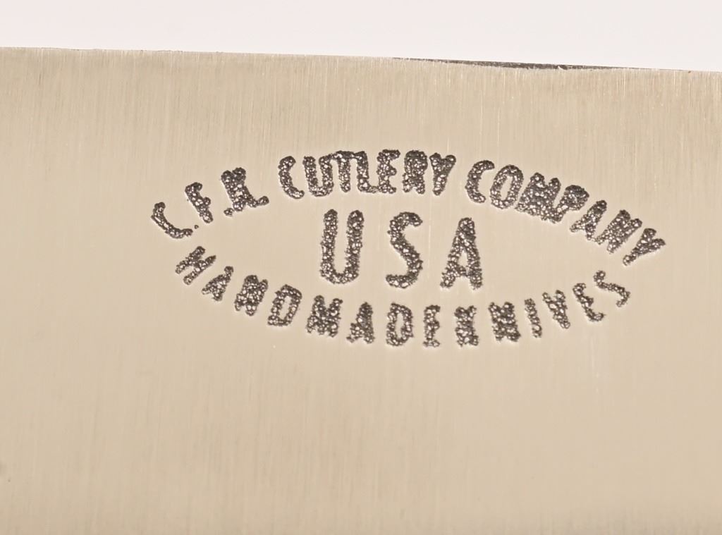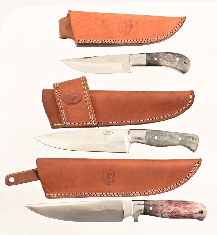 Smallest blade measures 5", with an 9" overall length. Largest knife blade 7", 12" overall. Stainless steel blades and bolsters, with stabilized/dyed bone grips. All have CFK Cutlery stamped leather sheaths.