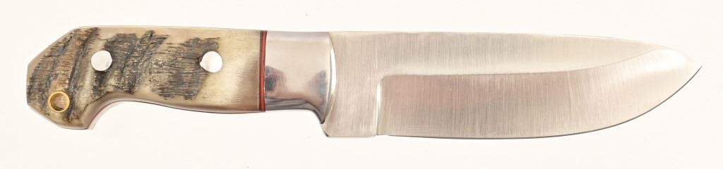 Stainless steel blades, 3.5" - 4.5" in length, largest knife measures 9" overall length. Ram horn gripped handles, with red liners. All include CFK Cutlery stamped leather sheaths.