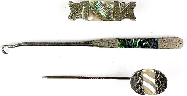 all with abalone and distinct Canon City engraving. Includes stick pin, button hook and lapel pin C. 1920-1940's. All remain in excellent condition. Est. 200-300