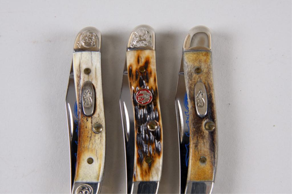 Collection of 3 Case 1 Blade Pocket Knives All with stag handles, two are blue scroll knives which means they left the factory in what is considered by Case to be in perfect condition, and the other is a special edition Ruger Case knife with the Ruger emAll with stag handles, two are blue scroll knives which means they left the factory in what is considered by Case to be in perfect condition, and the other is a special edition Ruger Case knife with the Ruger emblem. All are in like newcondition.